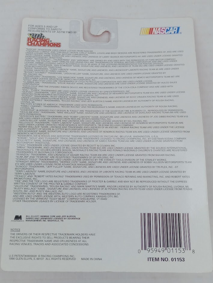 Driver: Ernie Irvan Country/Region of Manufacture: China gtin13: 0095949011538 Scale: 1:64 Organization: NASCAR Material: Diecast Race series: NASCAR Cup Series UPC: 0095949011538 Vehicle Type: NASCAR Racecar Brand: Racing Champions Series: Monster Energy NASCAR Cup Series Vehicle Year: 1996 Recommended Age Range: 3+