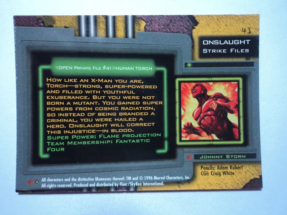 PLEASE DO NOT PAY FOR MULTIPLE PURCHASES SEPARATELY ! _____________________________________________________________________________ Here's what you get: Marvel Ultra Onslaught - Fleer/SkyBox International - 1996 Base Card No. Title Artists 41 Human Torch Adam Kubert, Craig White NOTE: CARD MAY SHOW A MINOR DEGREE OF " BRICKING " - SEE PHOTOS. YOU WILL RECEIVE THE CARD IN THE PHOTOS. YOU WILL RECEIVE THE CARD IN THE PHOTOS. _____________________________________________________________________________ Card stored in a smoke-free home. Payment due within 48 hours of purchase. NOTE: IF PURCHASING FROM MORE THEN ONE LISTING, PLEASE DO NOT PAY FOR THEM SEPARATELY, RATHER REQUEST AN INVOICE FROM ME, OR AWAIT RECEIPT OF AN INVOICE FROM ME BEFORE PAYING. When possible, I will combine shipping and handling. A tracking number will be provided on all First Class and Priority packages. You must have a confirmed eBay mailing address. My goal is to provide excellent service to buyers, so I may earn your business over and over. Any questions, please feel free to e-mail me. Please check out my other listings. Happy Collecting. _____________________________________________________________________________