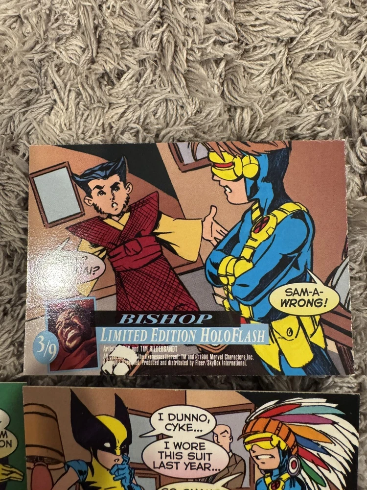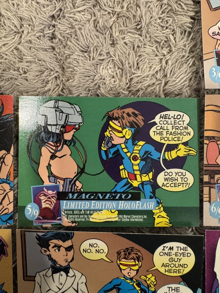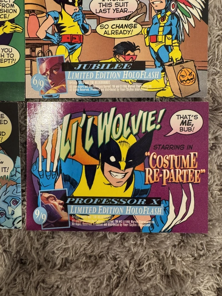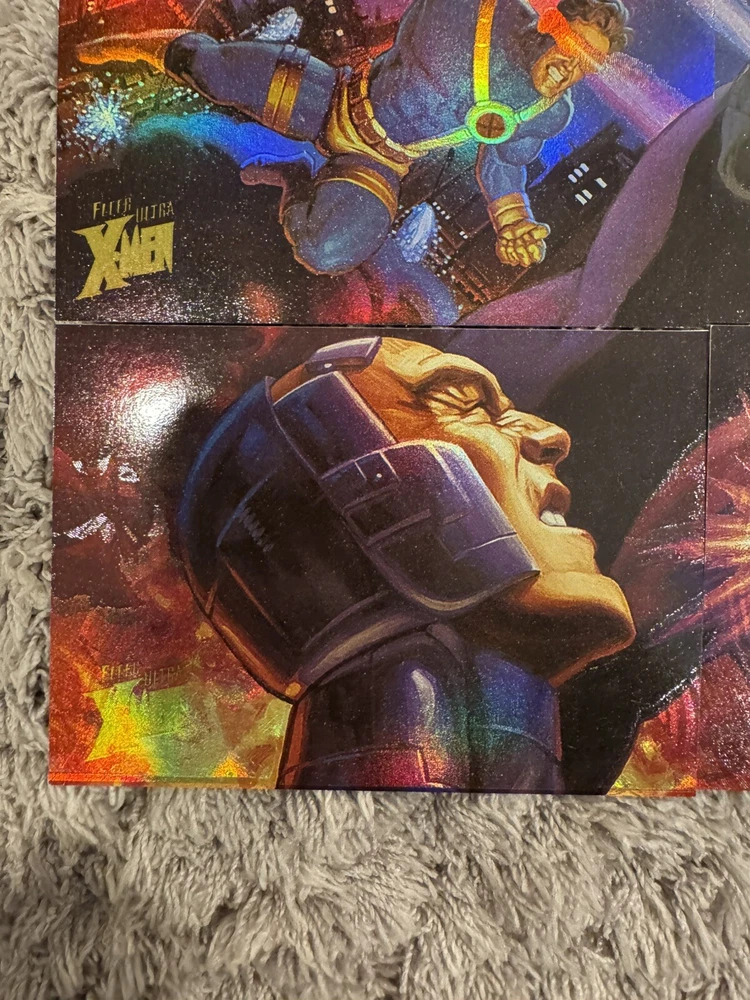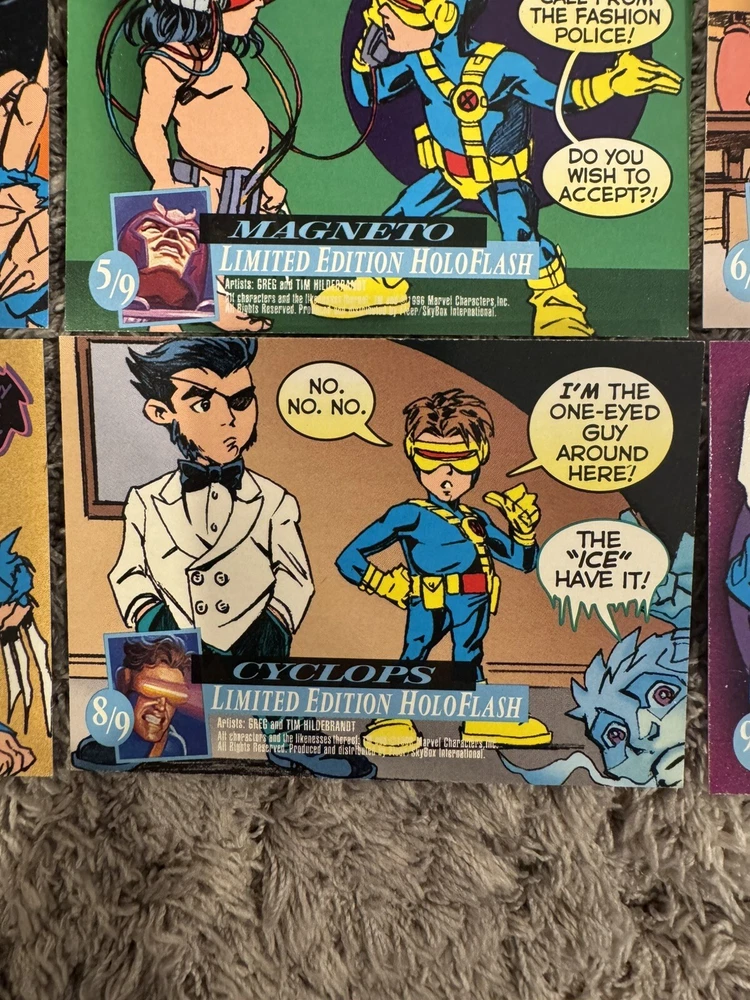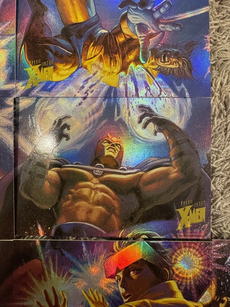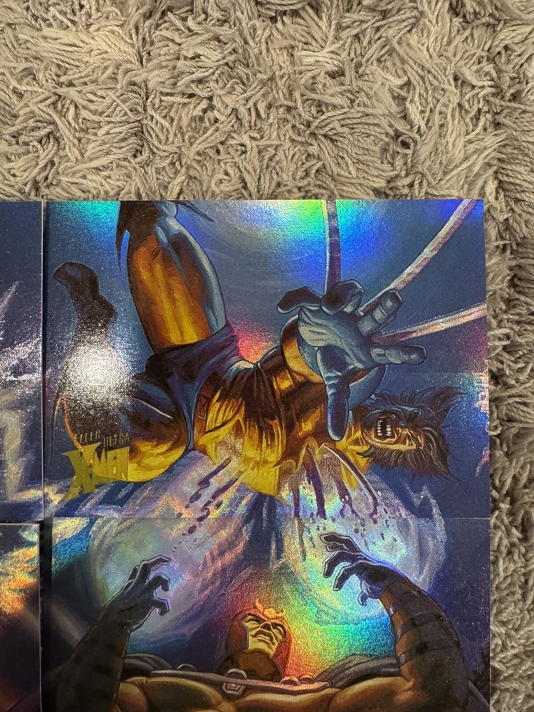 This is a 1996 Fleer Ultra Marvel X-Men Wolverine NEAR COMPLETE HOLOFLASH 3X3 PUZZLE INSERT CARD SET, #3-9! Includes an Original Pack Wrapper with purchase! Only missing 2 cards! 1 - Phoenix 2 - Gambit Set Includes: 3 - Bishop 4 - Wolverine 5 - Magneto 6 - Jubilee 7 - Storm 8 - Cyclops 9 - Professor X Condition: All cards are Near Mint/Mint. Will ship sandwiched between two thick pieces of cardboard for maximum protection to ensure they arrive undamaged and in perfect condition. Please ask with any questions.