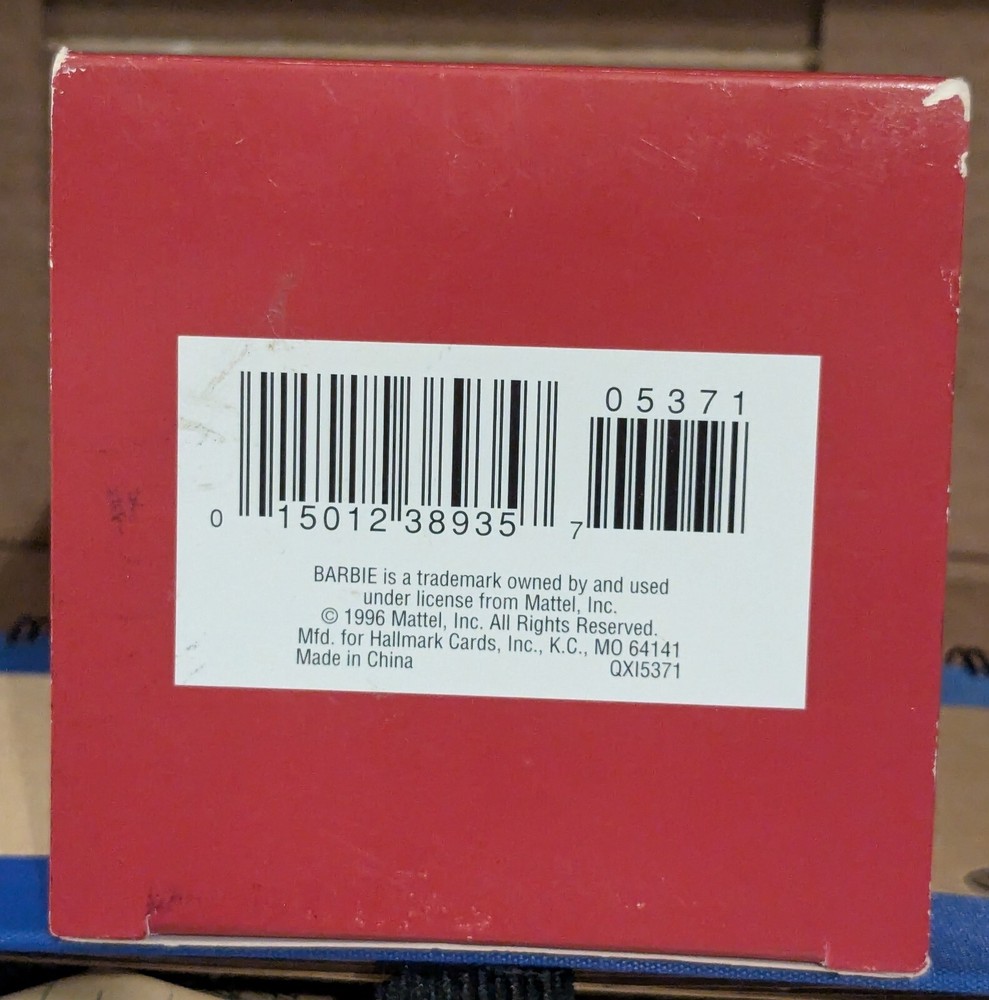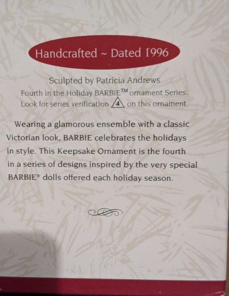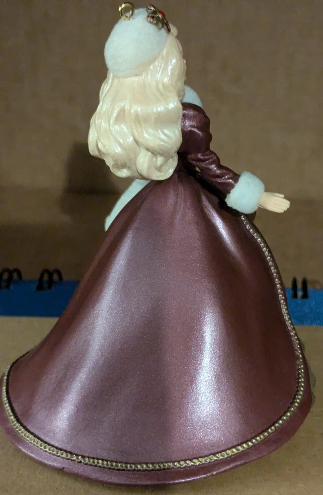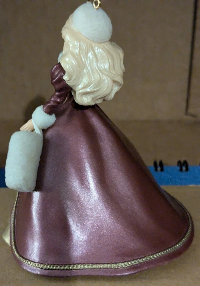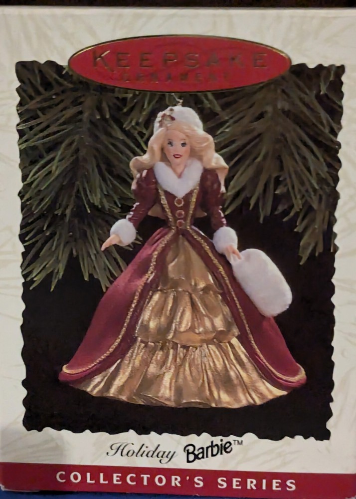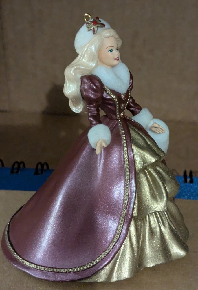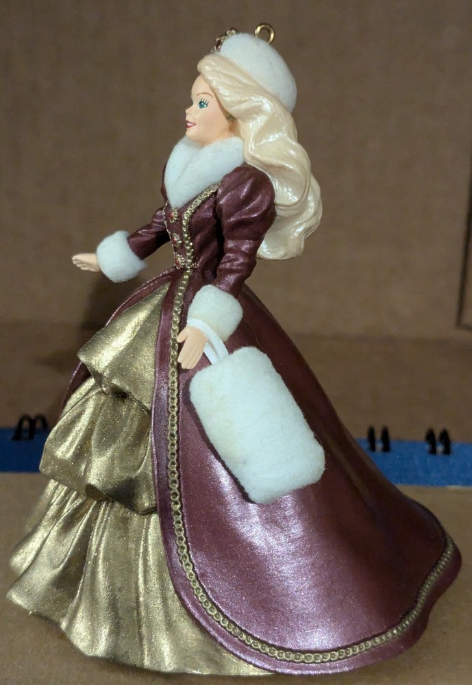 1996 Hallmark Keepsake Ornament: Holiday Barbie Celebrate the splendor of the season with the fourth ornament in the cherished Holiday Barbie Collector’s Series. Barbie is radiant in a gold hoop dress adorned with a rich burgundy coat, cinched at the waist to enhance her timeless elegance. Her accessories—a matching white muff and hat—add a touch of winter charm, perfectly complementing her long, flowing hair. Poised and graceful, this ornament is a dazzling representation of holiday beauty, making it an unforgettable addition to your festive décor or cherished collection.
