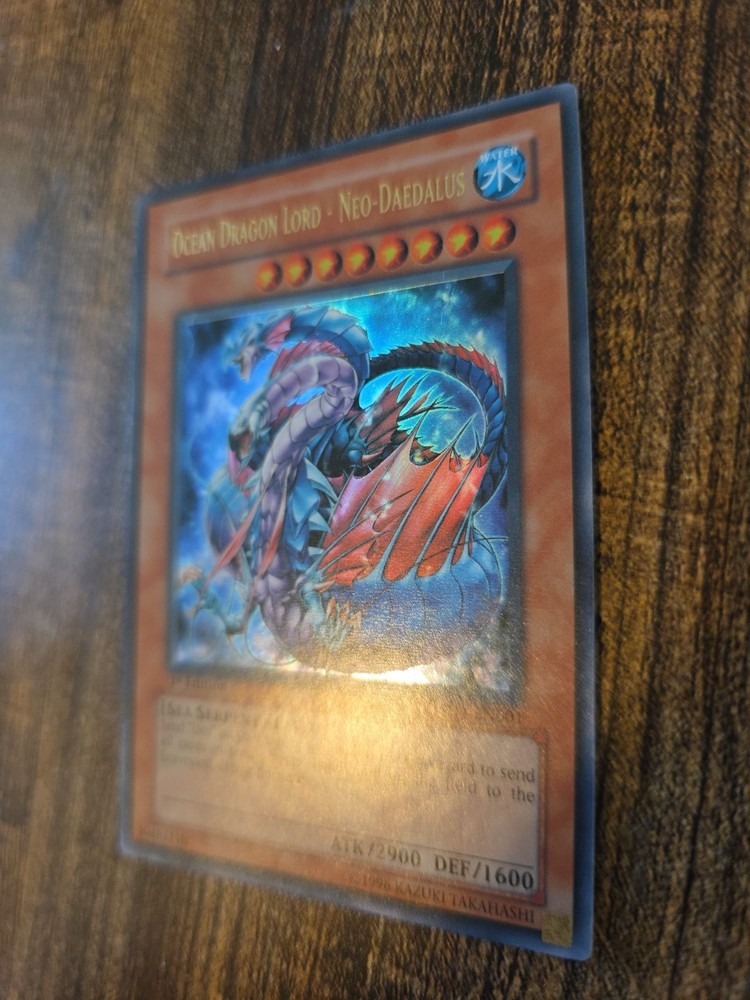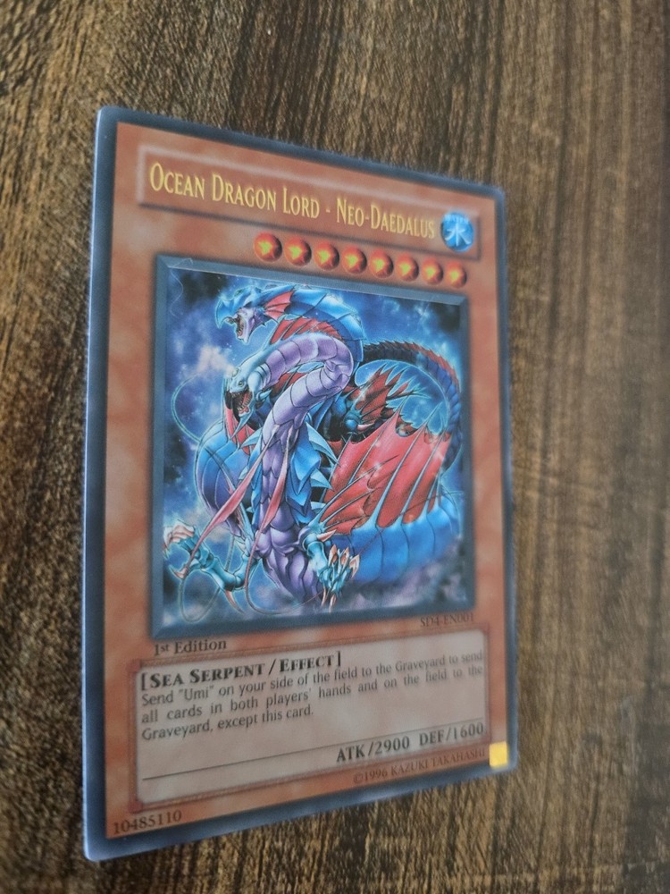 from personal collection. The 1996 1st Edition Ocean Dragon Lord - Neo-Daedalus SD4-EN001 is a highly sought-after Yu-Gi-Oh! TCG card from the Structure Deck: Fury from the Deep. This Ultra Rare card features a Water attribute, a Sea Serpent creature type, and a high defense/toughness of 1600. With an attack/power of 2900, this Normal card is in near mint or better condition and is a valuable addition to any collector's deck. Its corrected text allows for unique gameplay mechanics and is a key card for fans of the game.