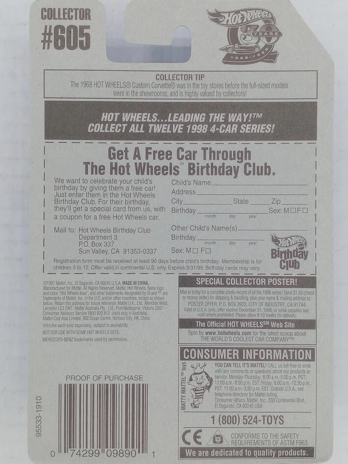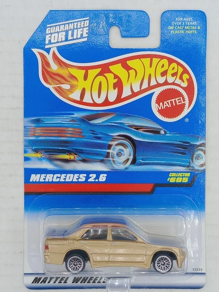 1996 Hot Wheels Blue/White Card #605 MERCEDES 2.6 Gold w/Chrome Lace Spoke Wheel SKU#101440 Look closely at the pictures to see further details. We ships USPS PLEASE see photos for detailed condition!! AC PLEASE LOOK AT THE PHOTOS CAREFULLY BEFORE PURCHASING!! If you are purchasing more than one item from us and would like combined shipping, PLEASE request an adjusted invoice from us while still in the cart and BEFORE paying. eBay does not usually calculate combined shipping accurately and you might get overcharged. Please be aware that when we photograph items, we use lighting that will show the details well. Although we try to present the product as accurately as possible, the lighting may affect the overall look of the item by appearing lighter/darker or possibly a different hue than the actual item. Depending on the type of lighting you have in your home, there may be some differences between the photos and the actual item. If this is a concern of yours, please feel free to request additional photos made in natural lighting or ask for a more detailed description of the item PRIOR TO PURCHASE! PLEASE NOTE: We greatly appreciate your interest in our item for sale. We look forward to a pleasant, quick and satisfying transaction for everybody, so please note the following information before bidding. Thank you! ITEM DESCRIPTIONS: * We will try to describe items well and provide plenty of photos. Please review these carefully before bidding or purchasing. * Only the items pictured and described are what you will receive when purchased. * We will occasionally offer an item clearly marked "AS-IS". This means that we are not sure if it works because we are unable to test it for whatever reason. We will offer these at a discounted price then a similar "working" item. It is possible that these items will work fine, but it also is possible that these items are more useful for their parts. Please only bid on or purchase these items if you are well aware of this, as we will only provide refunds of actual item price (no shipping cost refunds) for these items. * If you have any questions that aren't addressed by the descriptions or photos, please feel free to ask before you bid. * There may be bends, dents or parts of the blister that have minor issues due to long term storage. Such things will be pointed out under the description, please look closely at the pictures for further details. SHIPPING: * We usually do not offer shipping to international addresses, but ARE WILLING TO TAKE CONSIDERATIONS. * We try to pack items as carefully as possible, but damage may occur during shipping. If you receive an item that was damaged in shipping, please contact us and we will work with you to resolve the problem. * We will combine shipping costs for all items the same buyer purchases from us within 2 days. Please wait to pay for items until you're done shopping with us. Please contact us if you're expecting to buy more items from us, or to have us adjust the shipping costs. * We will usually ship items out within 24 hours of payment being received Sunday through Friday at noon. We will notify the buyer if there will be a delay in shipping for some reason. Please allow additional time for holidays and weekends when the post office is closed. If payment is received after noon (EST) on Friday, the item might not be shipped until the following Monday. * We do try to recycle shipping materials as much as possible. RETURNS: We abide by eBay's Money Back Guarantee. We definitely want our customers to be happy with their purchase! You may return an item within 30 days of receiving it with the following guidelines: * If the item is defective or damaged (unless we clearly marked the listing "AS-IS"), the buyer will receive a full refund after the buyer returns it and it is received by us. Customers who falsely claim their item is defective, damaged, or not as described in order to receive a full refund and free return shipping will be permanently blocked from making future purchases from us. * If the item is as described (including "AS-IS" items) and the buyer decides for any other reason than defective/damaged to return it, only the actual price of the item will be refunded once it has been returned and it is received by us. The buyer will be asked to pay all original and return shipping charges. This includes all reasons other than defective/damaged, including wrong size, wrong type, changed mind, etc. All "AS-IS" items will fall into this category of return. Please make sure the item is what you want before purchasing it. * Please contact us before initiating a refund request. FEEDBACK: We always leave feedback at the end of transaction. We consider the transaction to be over when we receive feedback from the buyer confirming the item arrived satisfactorily. If you are unsatisfied with your purchase please contact us before leaving neutral or negative feedback. WE APPRECIATE POSITIVE FEEDBACK IF YOU ARE SATISFIED WITH YOUR PURCHASE! THANK YOU FOR YOUR INTEREST IN THIS ITEM! !
