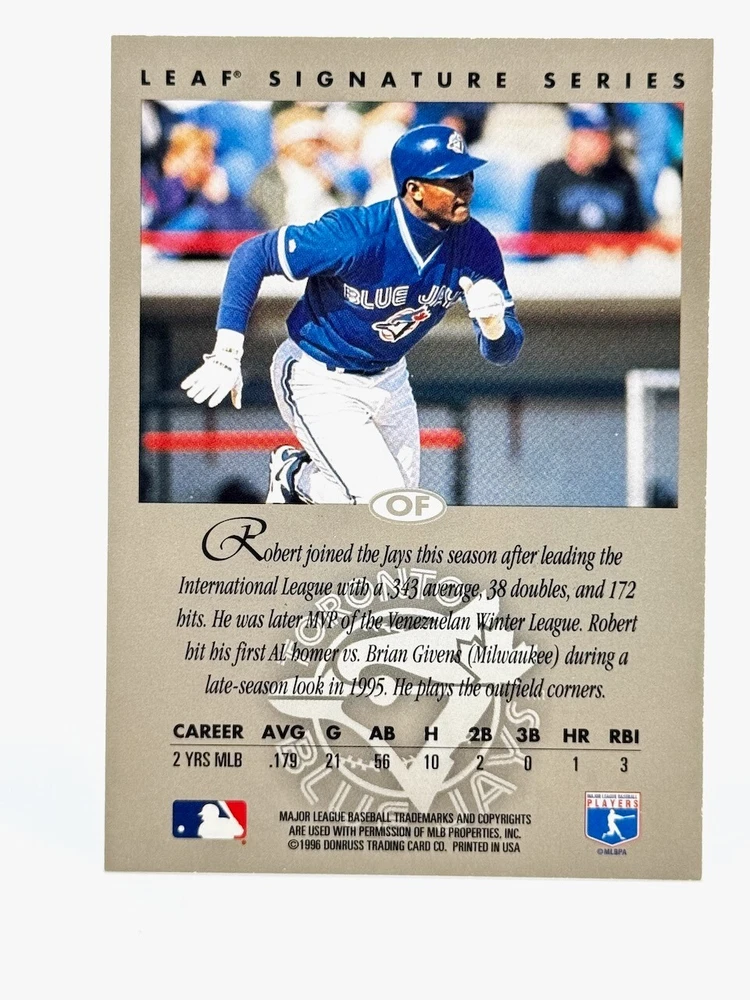 This 1996 Leaf Signature Series baseball trading card features an autograph from Robert Perez, a former player for the Toronto Blue Jays. The card is a short print and signature insert, making it a valuable addition to any sports trading card collection. The card is made from high-quality card stock and has the card number 17. The card is from the Major League Baseball (MLB) league and was manufactured by Hershey Canada, Inc. It is a type of sports trading card and features Robert Perez's autograph. This card is a great find for any baseball fan or collector.