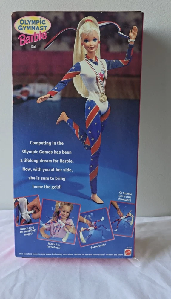 This 1996 Mattel Olympic Gymnast Barbie is a must-have for any Barbie collector. Commemorating the Atlanta summer games and complete with accessories and uniform. The Barbie has blonde straight hair, blue eyes, and light complexion. Never removed from packaging. Box is in excellent condition.