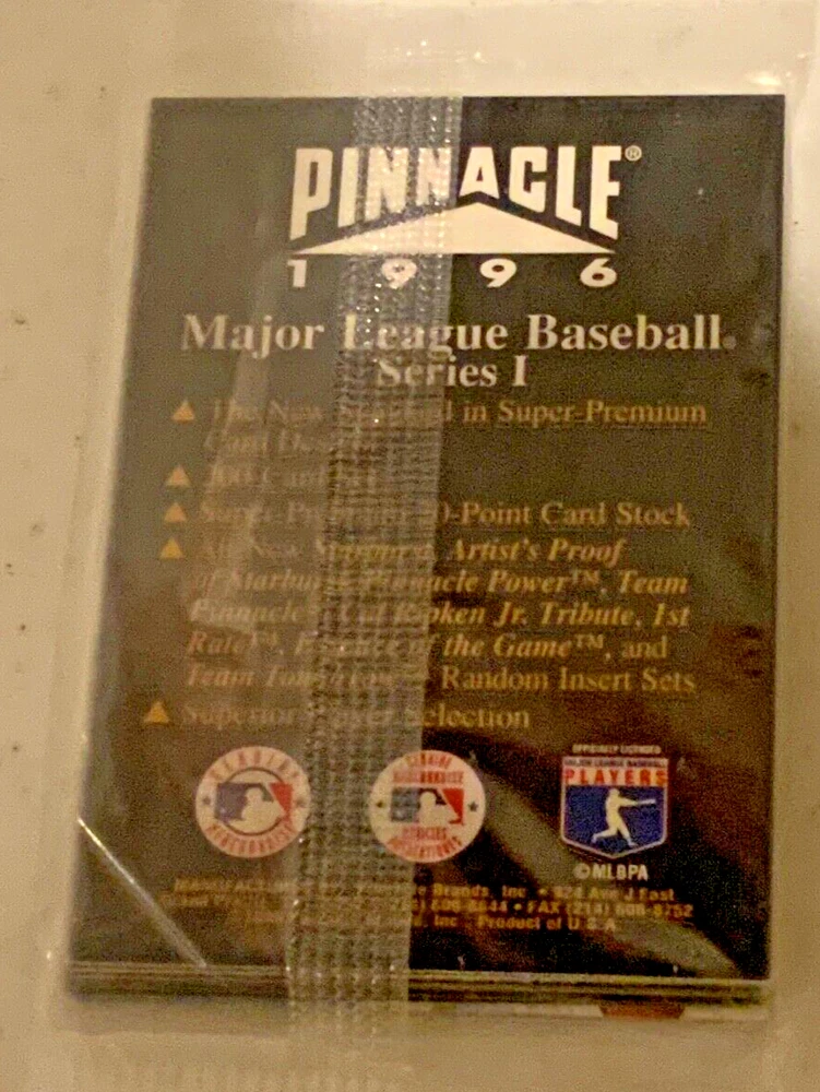 1996 PINNACLE PROMO PACK This is for 1 pack from a one owner wax box. Purchased new back when I had a card shop so many years ago. These have been kept in storage in my A/C home in one of several boxes with other unopened packs that I am starting to finally sell. It includes 8 cards featuring top players like Greg Maddux and Mike Piazza. The pack is from the MLB and features teams like the BOSTON RED SOCKS, NEW YORK YANKEES, ATLANTA BRAVES & LOS ANGELES DODGERS from their 1995 season. From a smoke free environment. Send wrapped, padded and packed in a solid box with tracking.