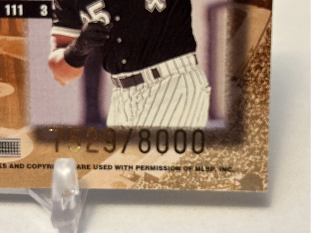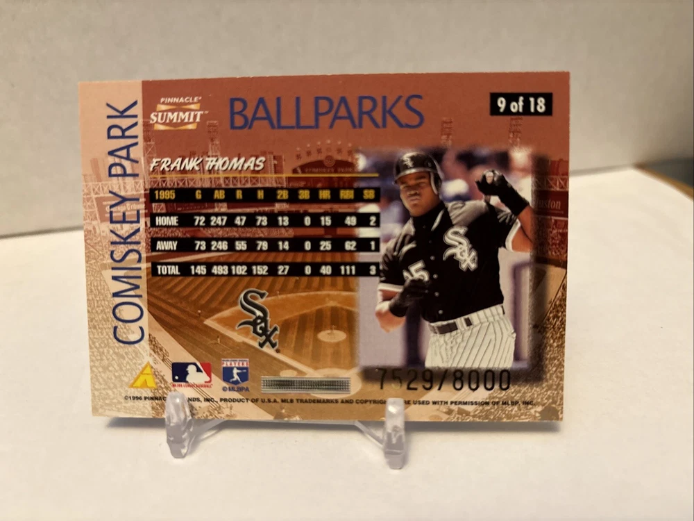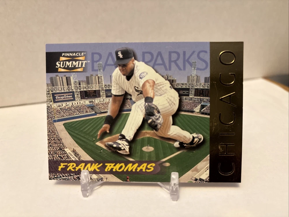 1996 Pinnacle Summit trading card featuring Frank Thomas of the Chicago White Sox. This sports trading card is part of the Ballparks insert set, with a serial number out of 8000. It is from the 1996 season and manufactured by Pinnacle for Major League Baseball (MLB) collectors.