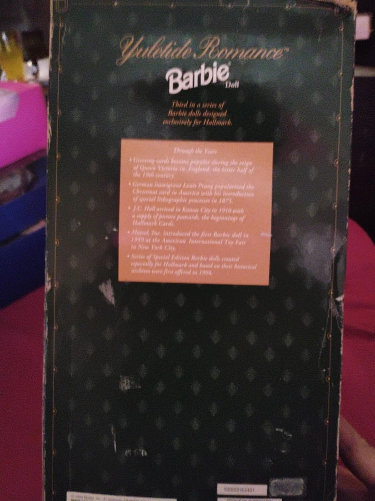 This 1996 Special Edition Hallmark Yuletide Romance Barbie #15621 is a beautiful addition to any doll collection. The doll features a Caucasian complexion, with varying eye and hair colors and types. The doll is 11 1/2 inches tall and 7 inches wide, with a length of 14 inches and a weight of 1.5 lbs. This original, never opened doll is part of the Yuletide Romance product line and is a must-have for any Barbie fan. The doll comes in its original packaging and is a single unit. It is a girl doll and is not personalized or signed. The doll is an original, licensed reproduction from Mattel and was manufactured in China in the 1990s. Box has some damage