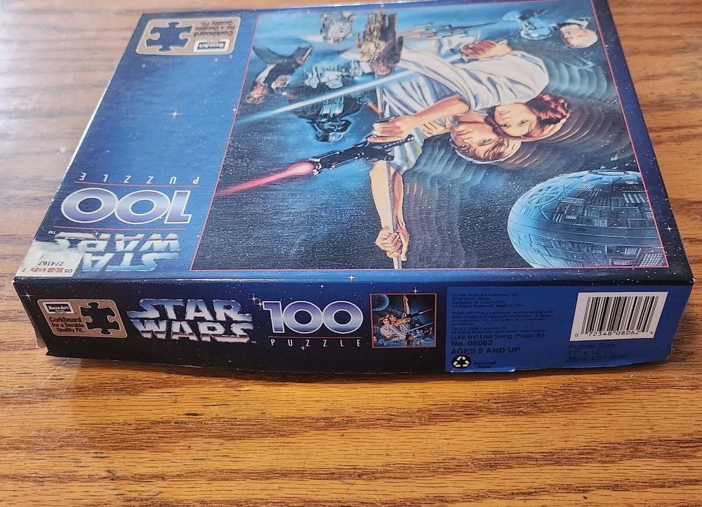 Up for auction is a rare vintage Star Wars puzzle, featuring the iconic characters of Luke Skywalker and Princess Leia. This 100-piece puzzle was produced by RoseArt in 1996 and is a must-have for any Star Wars collector. Puzzle is used and I did not verify all the pieces were in the box. Box was in storage for years, please look at pictures for condition.