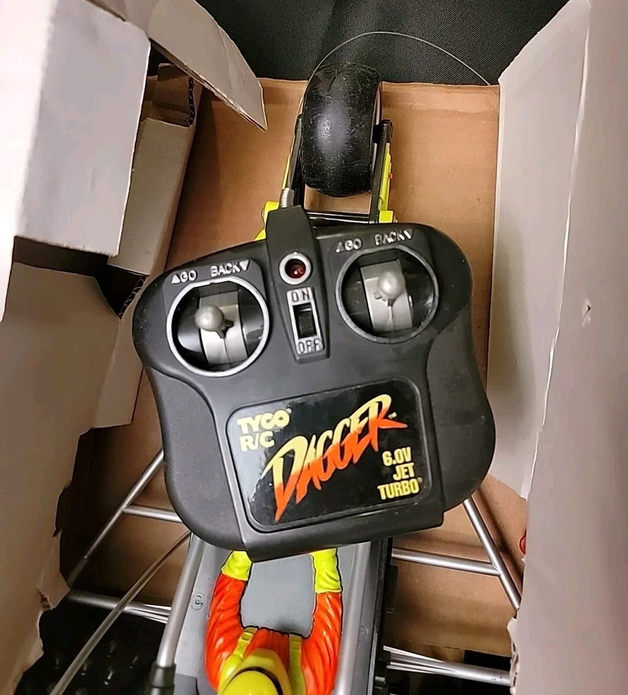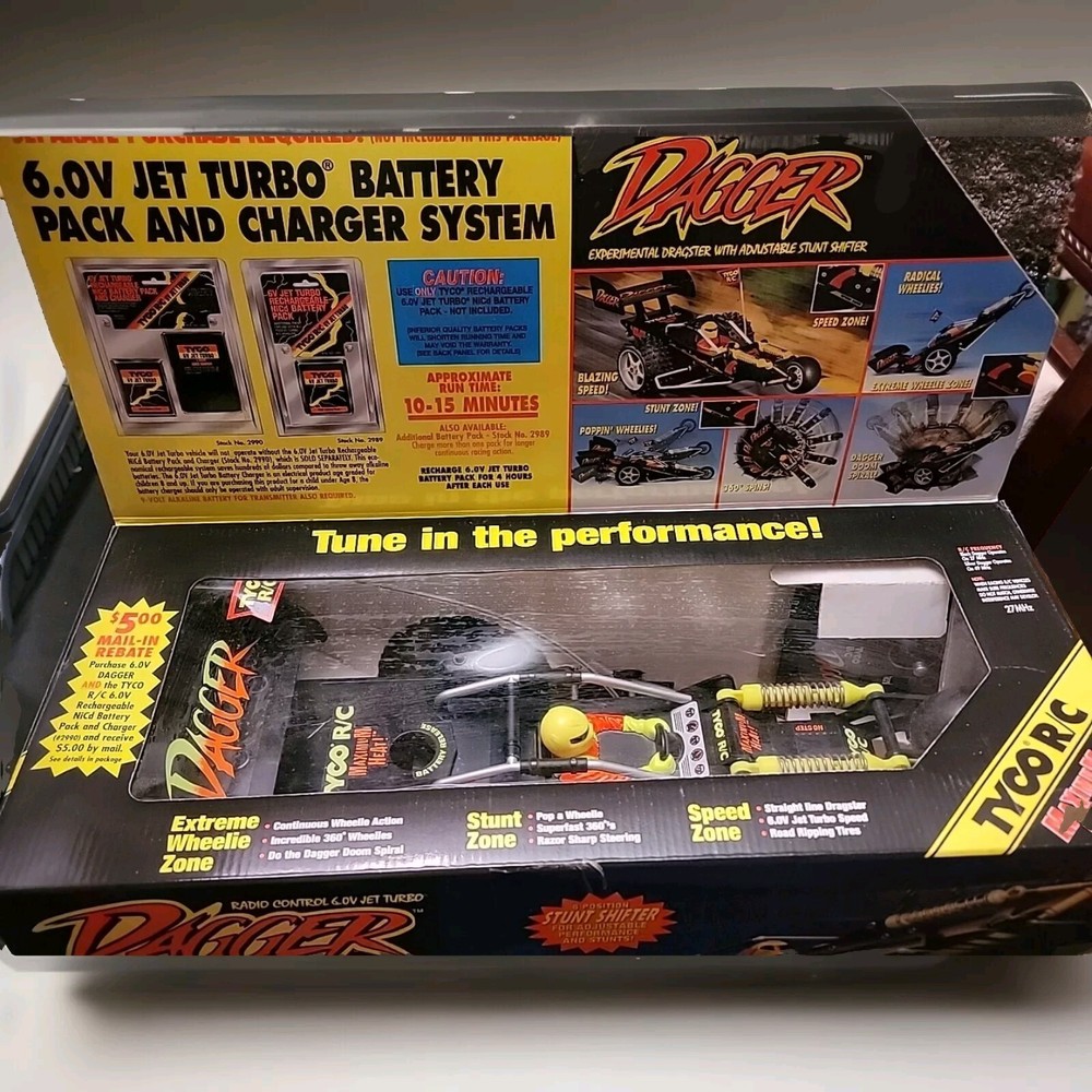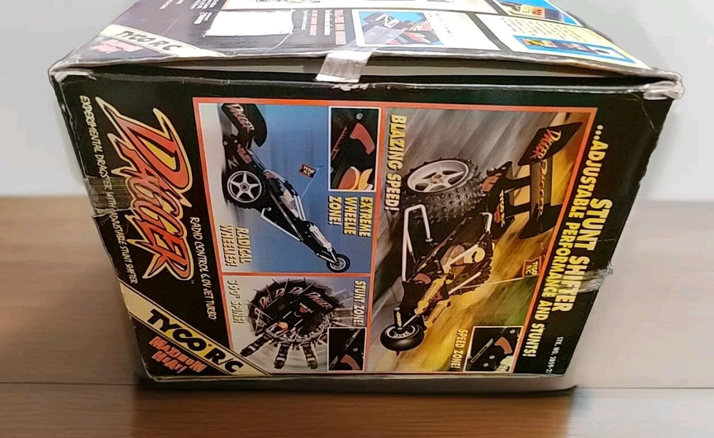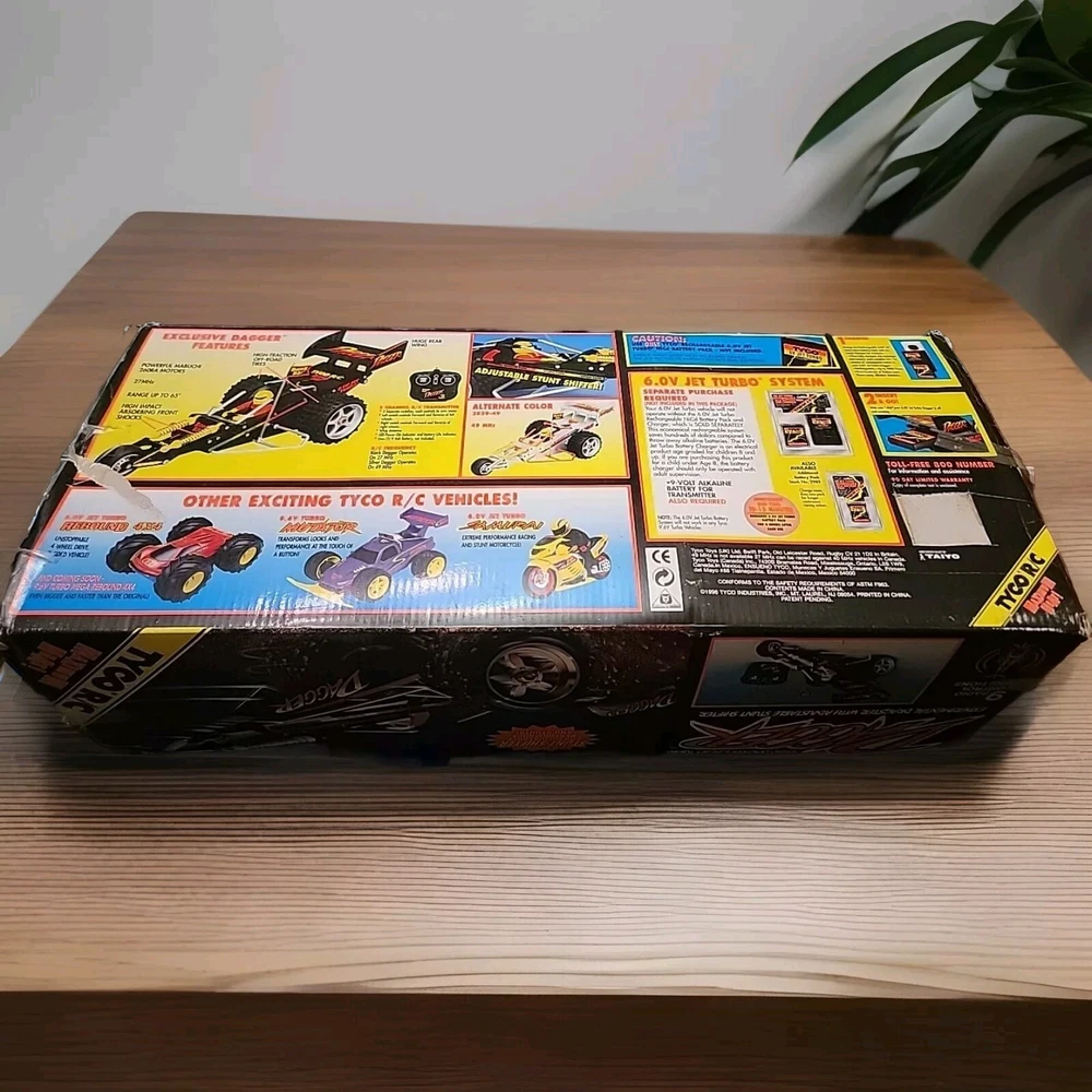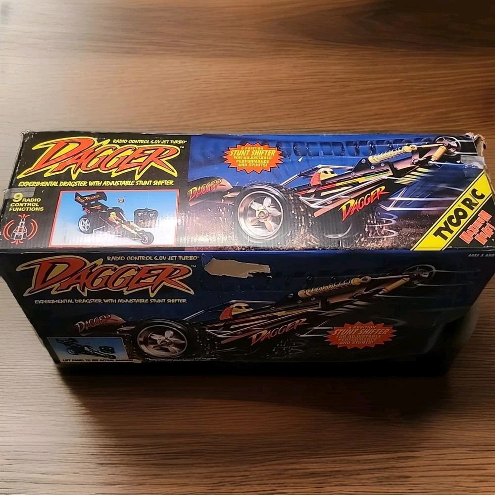 Preowned but in good condition. Box is damaged, but contents inside are in great shape. No battery or instructions include. See pictures for details. *UNTESTED* This vintage TYCO Dagger model car is a great addition to any RC collection. With its sleek black color and rare characteristics, it's sure to catch the eye of any collector or enthusiast. The car is made of durable plastic and features a brushed motor type, making it suitable for both off-road and on-road use. This 2WD drag car comes ready to go with all included parts and is recommended for ages 8 and up. The TYCO Dagger also has a product line of its own, called TYCO R/C Maximum Heat, which adds to its uniqueness and value. Take this lightly used gem for a spin and experience the thrill of vintage RC racing.