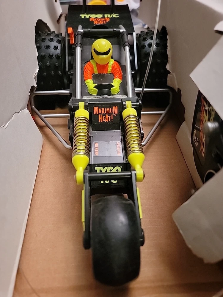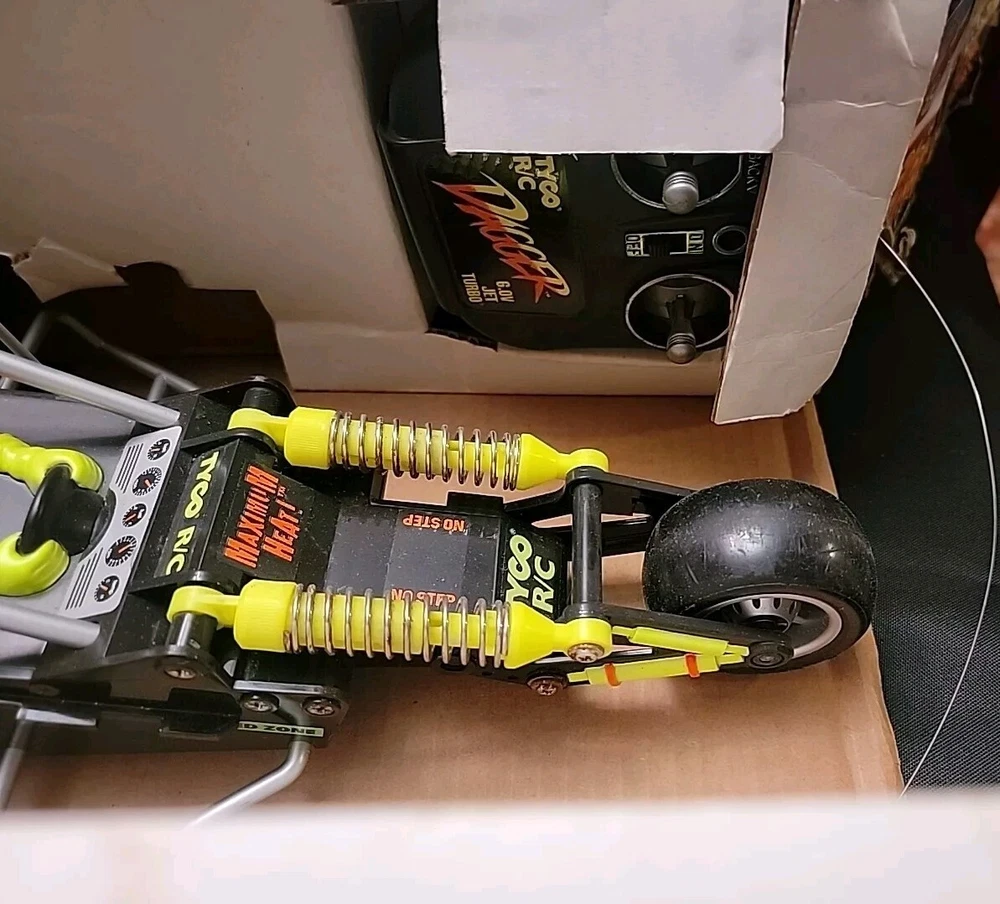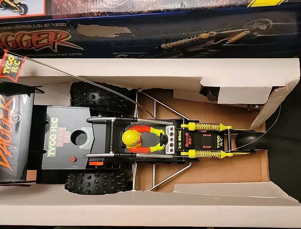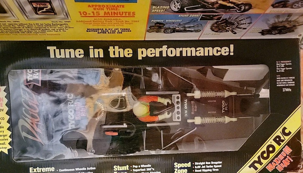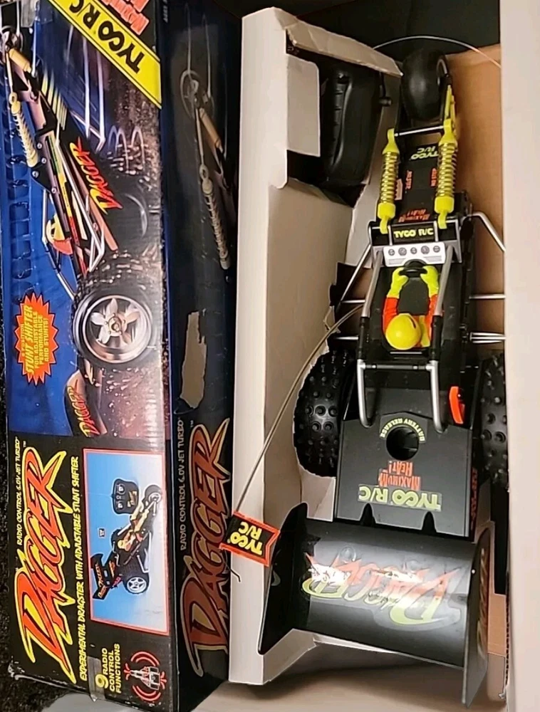 Preowned but in good condition. Box is damaged, but contents inside are in great shape. No battery or instructions include. See pictures for details. *UNTESTED* This vintage TYCO Dagger model car is a great addition to any RC collection. With its sleek black color and rare characteristics, it's sure to catch the eye of any collector or enthusiast. The car is made of durable plastic and features a brushed motor type, making it suitable for both off-road and on-road use. This 2WD drag car comes ready to go with all included parts and is recommended for ages 8 and up. The TYCO Dagger also has a product line of its own, called TYCO R/C Maximum Heat, which adds to its uniqueness and value. Take this lightly used gem for a spin and experience the thrill of vintage RC racing.
