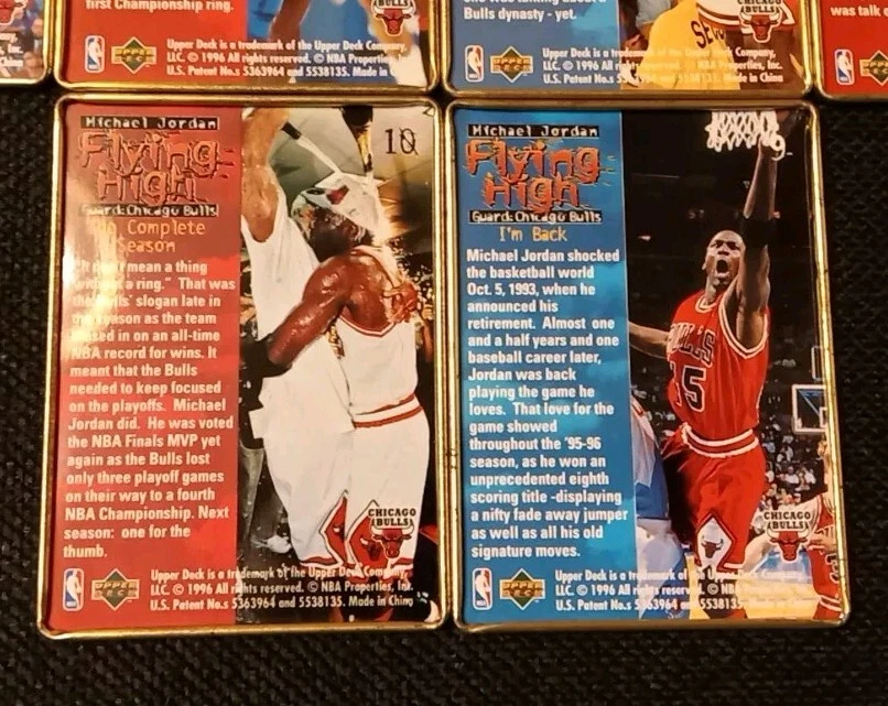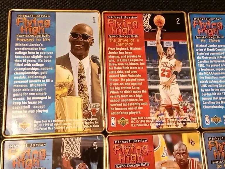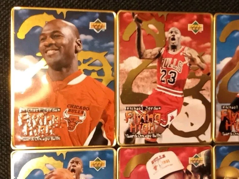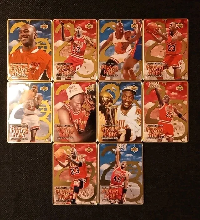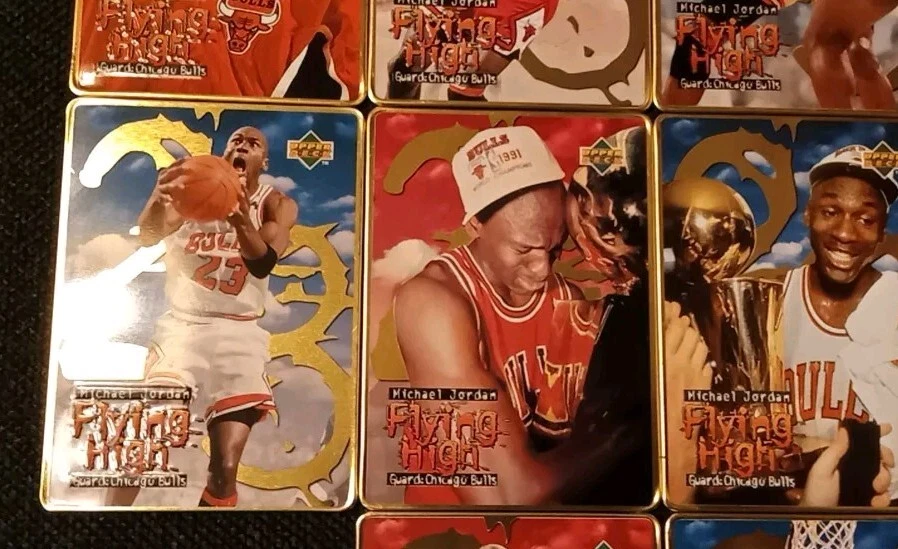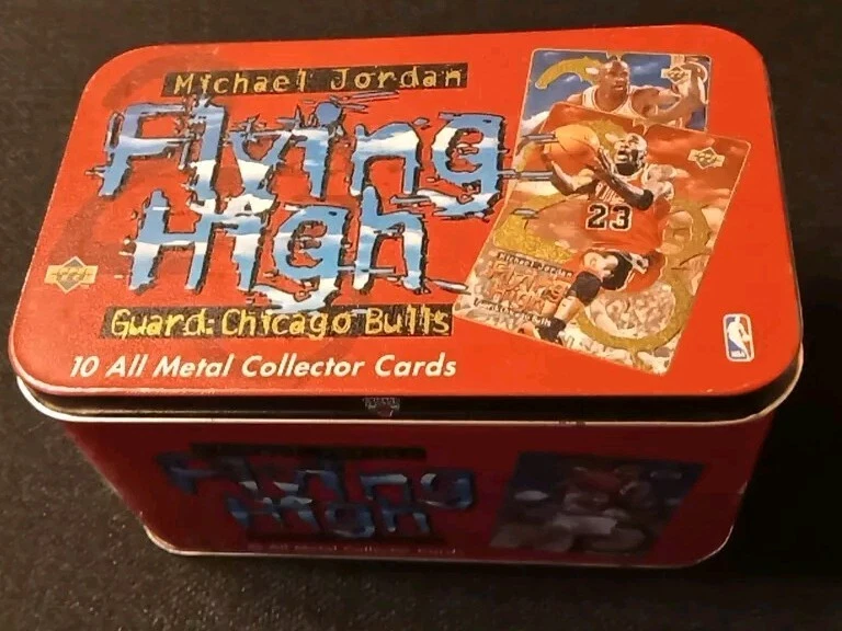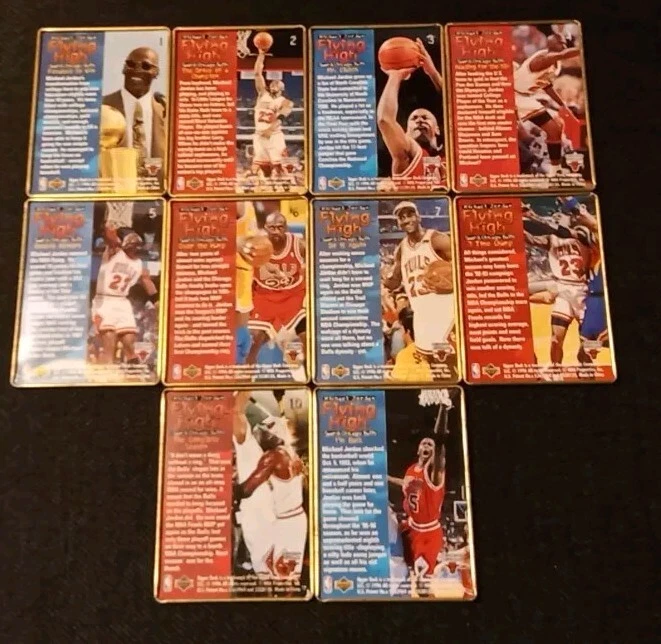 Take a look at this amazing 1996 Upper Deck Michael Jordan Flying High 10 Card Set. This set includes rare metal cards that are a must-have for any basketball trading card collector. The cards feature Jordan in action during the 1996-97 season and are a perfect addition to your collection. The set comes complete with all 10 cards and is a great investment for any collector. Don't miss out on this opportunity to own a piece of basketball history. Original tin with plastic card divider is included with free shipping. See photos for close ups and conditions.