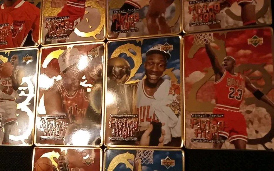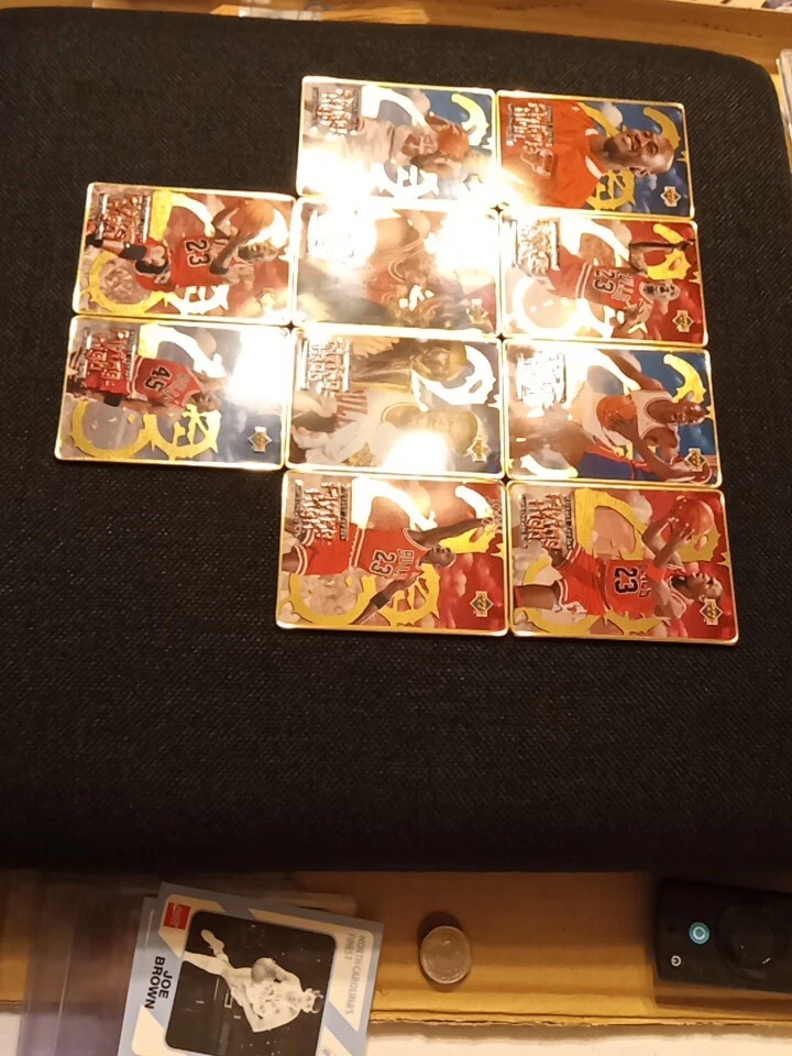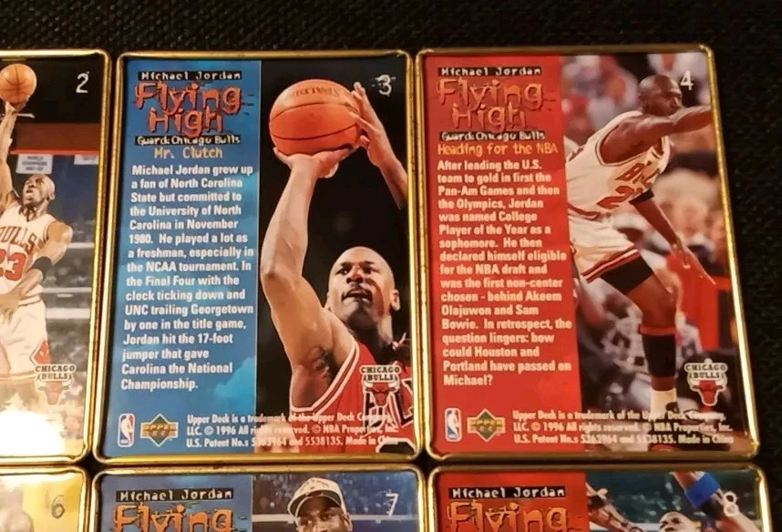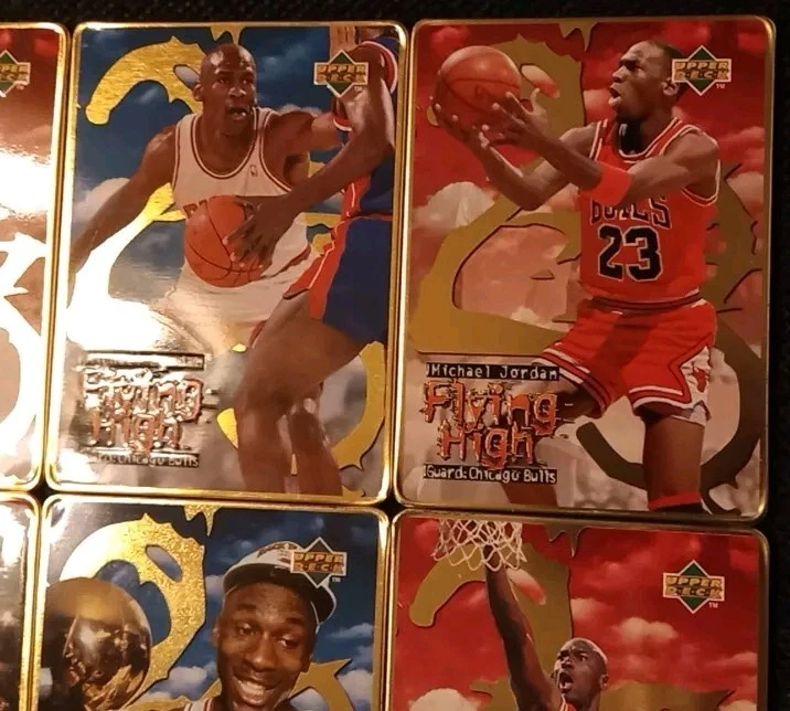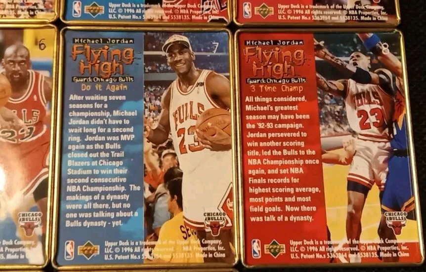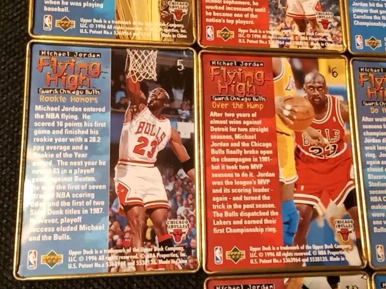 Take a look at this amazing 1996 Upper Deck Michael Jordan Flying High 10 Card Set. This set includes rare metal cards that are a must-have for any basketball trading card collector. The cards feature Jordan in action during the 1996-97 season and are a perfect addition to your collection. The set comes complete with all 10 cards and is a great investment for any collector. Don't miss out on this opportunity to own a piece of basketball history. Original tin with plastic card divider is included with free shipping. See photos for close ups and conditions.