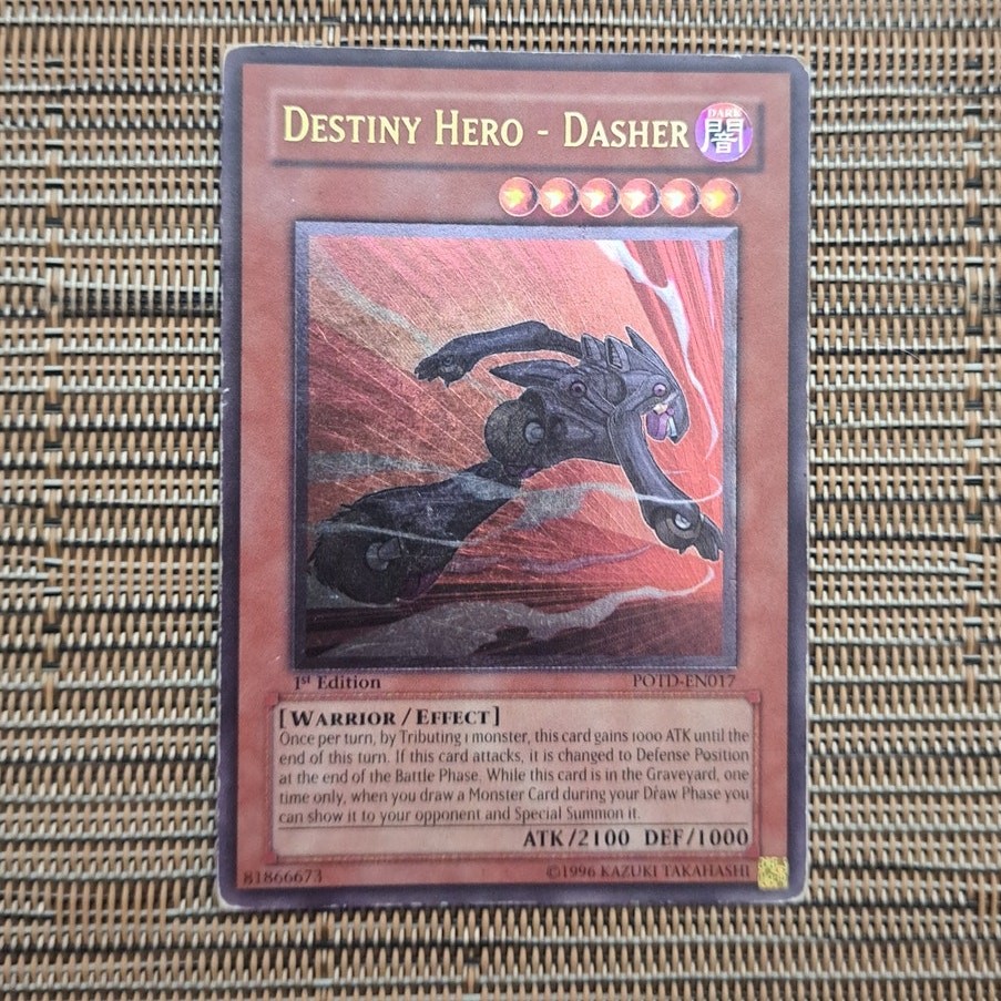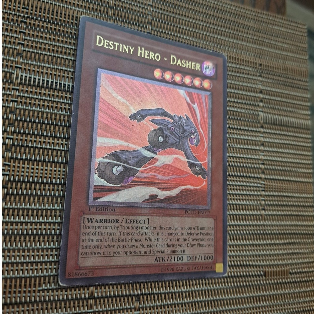 1996 Yu-Gi-Oh! 1st Edition Destiny Hero Dasher Card POTD-EN017. Please see all photos and judge condition for yourself. Will ship fast and with extreme care.