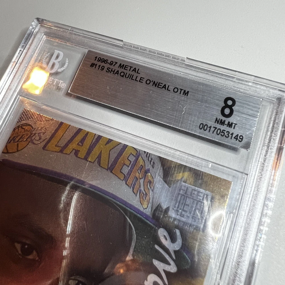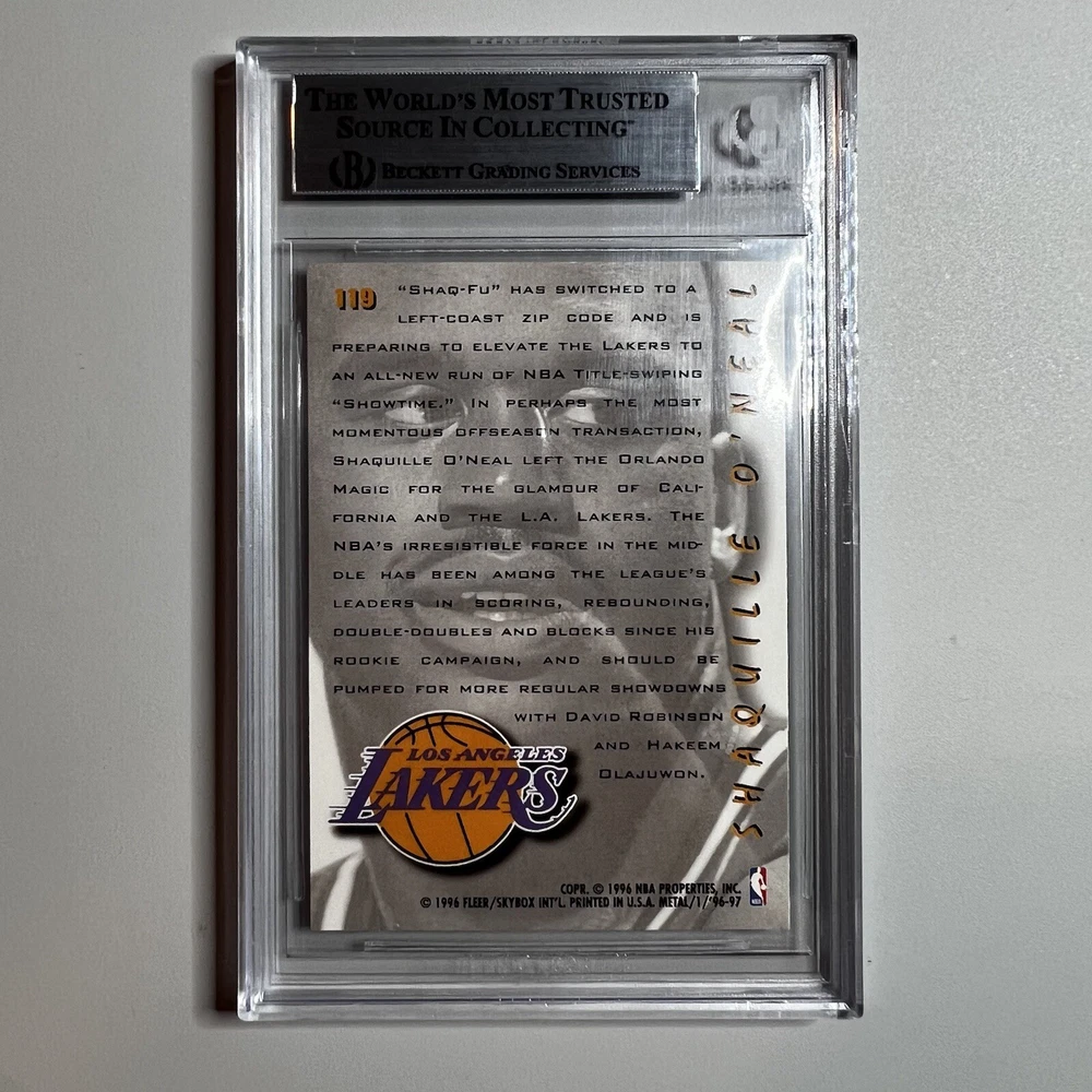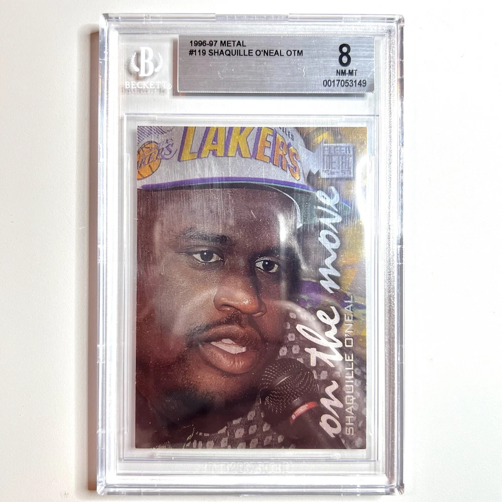 Discover a piece of basketball history with the 1996-97 Fleer Metal #119 Shaquille O’Neal “On The Move” card, graded by Beckett Grading Services (BGS) at a solid 6.5 EX-MT+. This card captures the essence of the NBA legend during his tenure with the Los Angeles Lakers, making it a must-have for fans and collectors alike. As part of the esteemed 1996-97 Fleer Metal set, this card showcases the base set design and features that are treasured by collectors. With its vibrant graphics and well-preserved quality, this Shaquille O’Neal sports trading card is a standout piece that represents a significant moment in basketball and sports memorabilia.