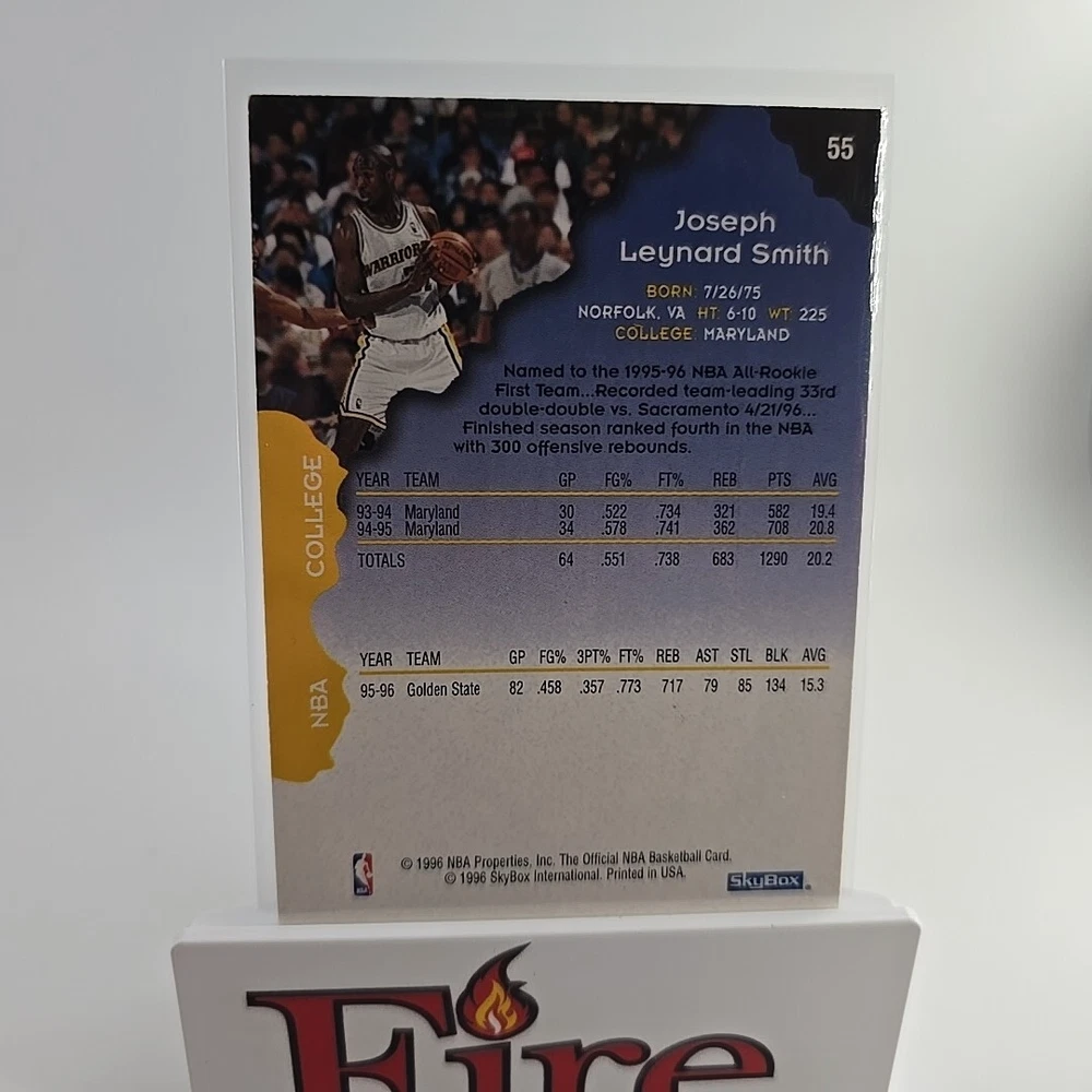 This sports trading card features Joe Smith of the Golden State Warriors from the 1996-97 NBA season. It is an original licensed print from the SkyBox manufacturer and part of the NBA Hoops set. The card number is 55 and it is a base set card. The card is standard size and has not been autographed. The card is perfect for collectors of basketball memorabilia and fans of the National Basketball Association (NBA). It would make a great addition to any sports trading card collection and is a must-have for fans of Joe Smith and the Golden State Warriors. Don't miss your chance to own this piece of NBA history! Thank you for your interest, don't let it get away bid today!