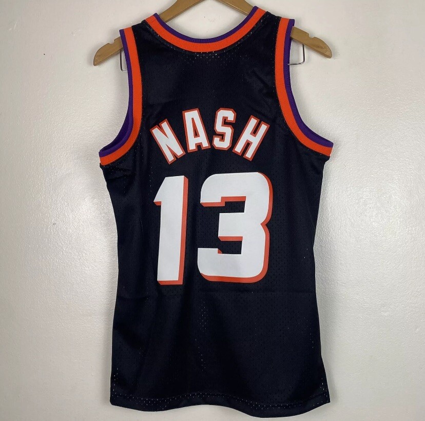 Show your love for the Phoenix Suns with this Mitchell & Ness 1996-97 Steve Nash HWC Swingman Jersey. The jersey features the number 13 and is made of high-quality materials that ensure comfort and durability. It comes in a purple, orange, and white color combination that is perfect for any basketball fan. This officially licensed jersey is a must-have for any Steve Nash or Phoenix Suns fan. It is designed for men and is available in size L. The jersey is part of the Hardwood Classics collection and is perfect for regular season games. Get yours today and show your support for the Phoenix Suns!