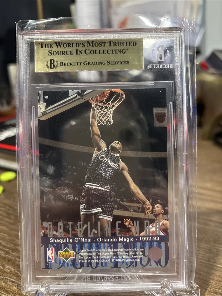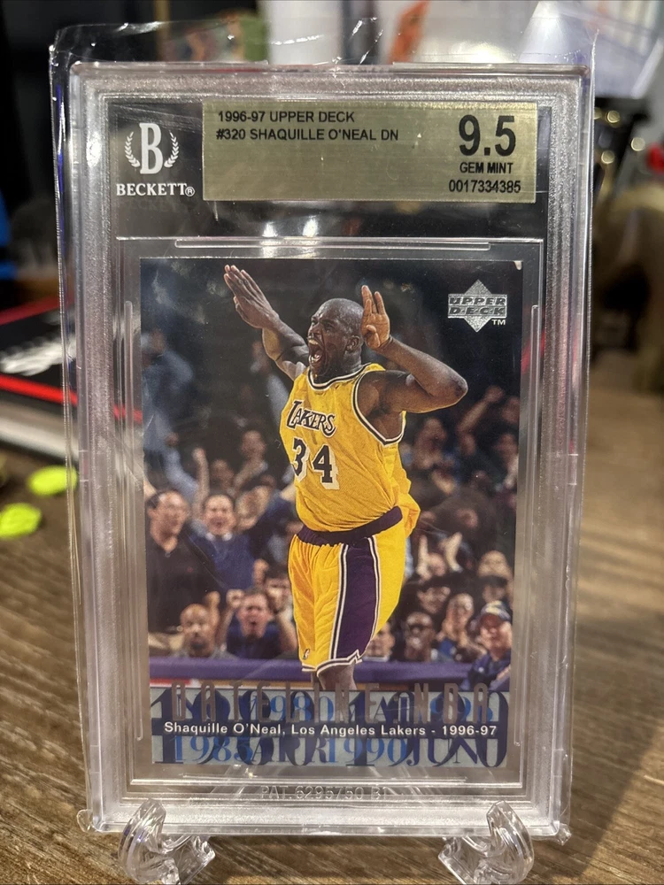 Step into the world of sports memorabilia with the 1996-97 Upper Deck #320 Shaquille O'Neal card, a must-have for any basketball enthusiast or card collector. Featuring the legendary Laker center in his prime, this card is a tangible piece of sports history. Graded a 9.5 Gem Mint by Beckett Grading Services (BGS), it boasts an exceptional quality that's sure to be the centerpiece of your collection. With its origin from the iconic 1996-97 Upper Deck Base Set, this card captures the essence of the era and the athlete's dominance in the NBA. The card's sharp corners, brilliant colors, and pristine surface reflect its high grade, making it an outstanding piece for both investment and display. Add a piece of the basketball legacy to your collection today with this exceptional Shaquille O'Neal sports trading card.