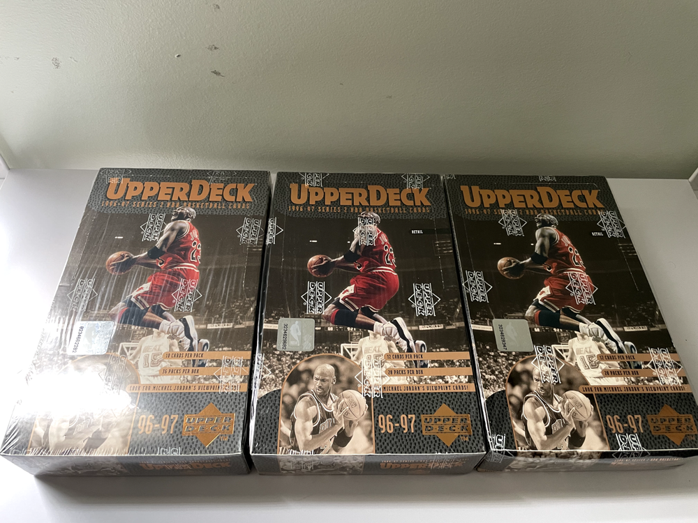 The product is a sealed 1996-97 Upper Deck NBA Series Two Hobby Box, which contains sports trading cards focusing on basketball from the National Basketball Association (NBA). Produced by Upper Deck, the box is part of Series 2 and is an original release from 1996. This specific box configuration consists of 3 boxes, each containing a set number of trading cards featuring players from the 1996-97 NBA season. It is a sought-after item for collectors looking to add to their collection of sports trading cards. (EACH BOX SOLD SEPERATLY OR CAN BE PACKAGED AT NEGOTIATED PRICE)