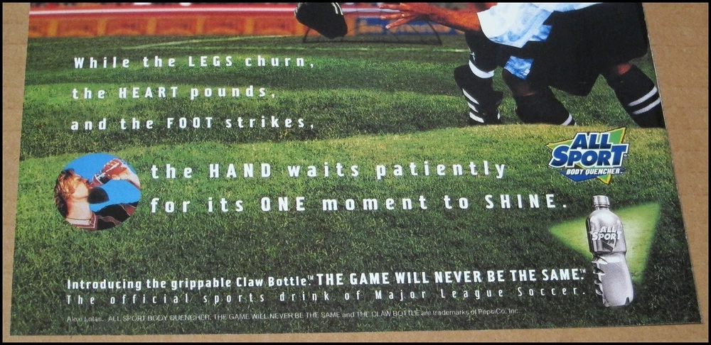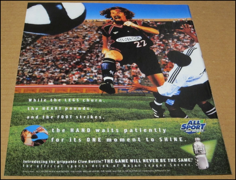 1997 Alexi Lalas All Sport Sports Drink Print Ad A Single Magazine Page Print Advertisement This ad was pulled from a 1997 issue of Sports Illustrated magazine Advertisement is for All Sport - the official sports drink of Major League Soccer Pictures Alexi Lalas of the New England Revolution Page measures roughly 8" x 10.25" Condition: Excellent - hand cut along the right edge (see images) Free shipping in the U.S.A.