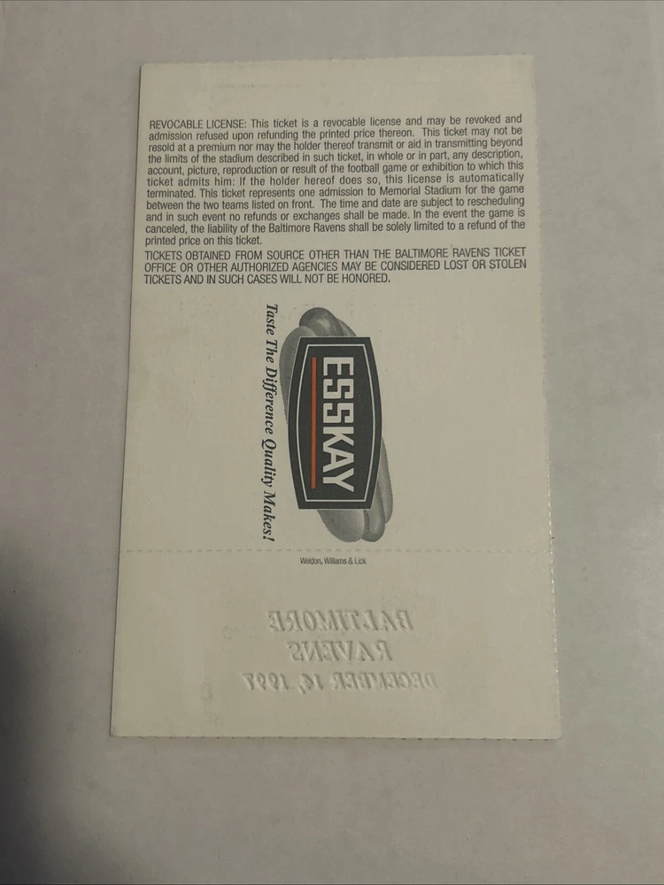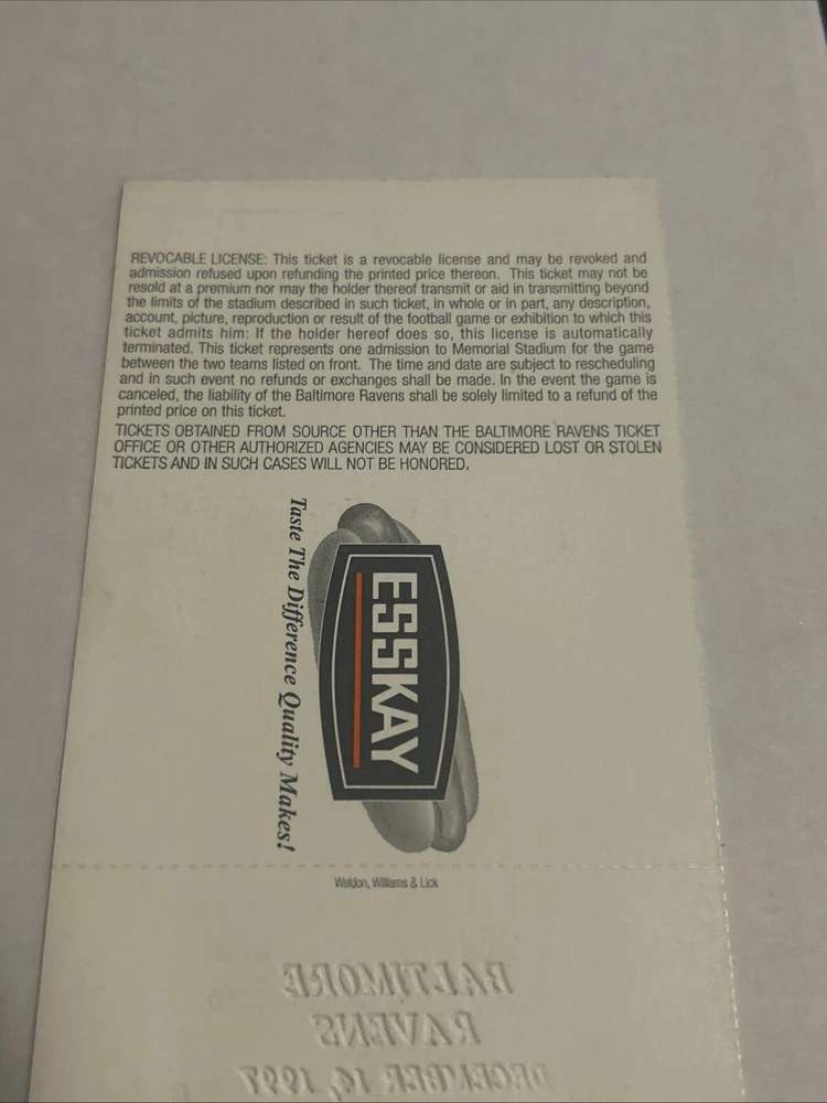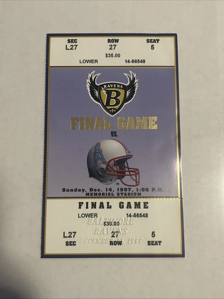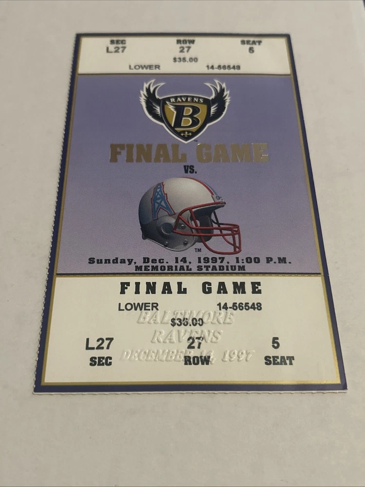 1997 Baltimore Ravens Final Game Ticket Stub at Memorial Stadium vs Houston Oilers - 12/14/97