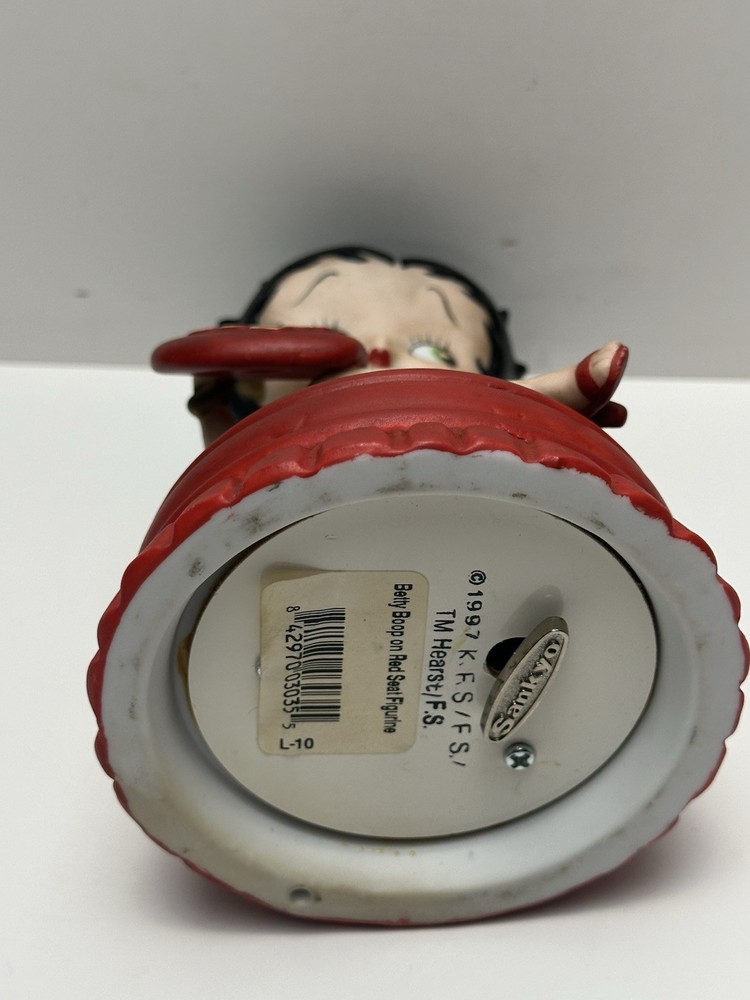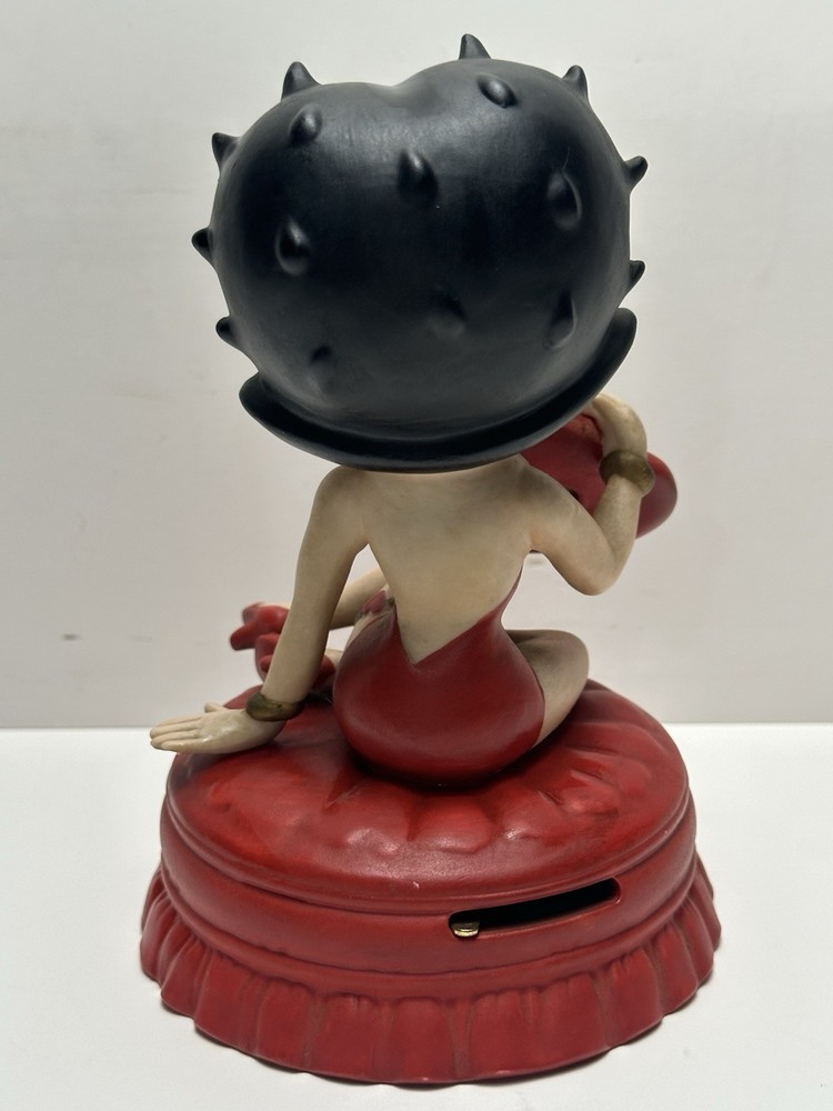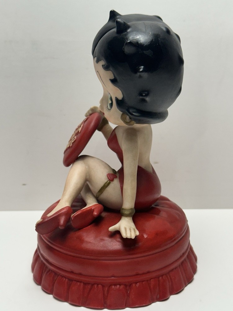 The vintage 1997 Boop Oop-a Doop Betty Boop Heart Theme Musical Figurine is a charming collectible featuring the iconic animated character Betty Boop. Created by The San Francisco Music Box Company, this ceramic figurine stands at 5.5 inches tall and plays a delightful musical tune. With a Valentine Heart theme and a wind-up feature, this nostalgic piece from 1997 is a perfect addition to any animation or Betty Boop memorabilia collection. Made in Sri Lanka, this unique item offers a glimpse into the world of classic animation and musical toys.