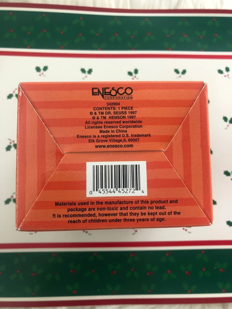 You are buying a Dr. Seuss ENESCO GRINCH Christmas Ornament (Seasonal Specialties, 1997). Ornament is in good used condition, with no major visible wear. Ornament comes complete with original box. (box torn from age and storage). Please see pictures for details. Thank you for looking!