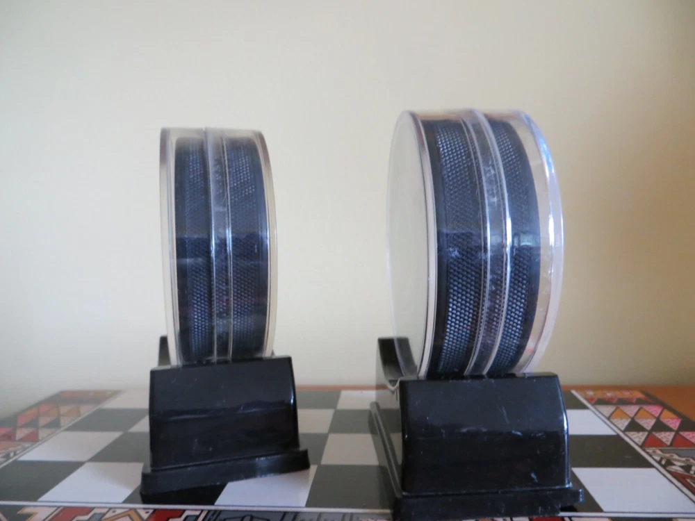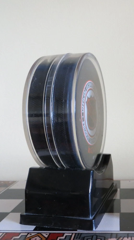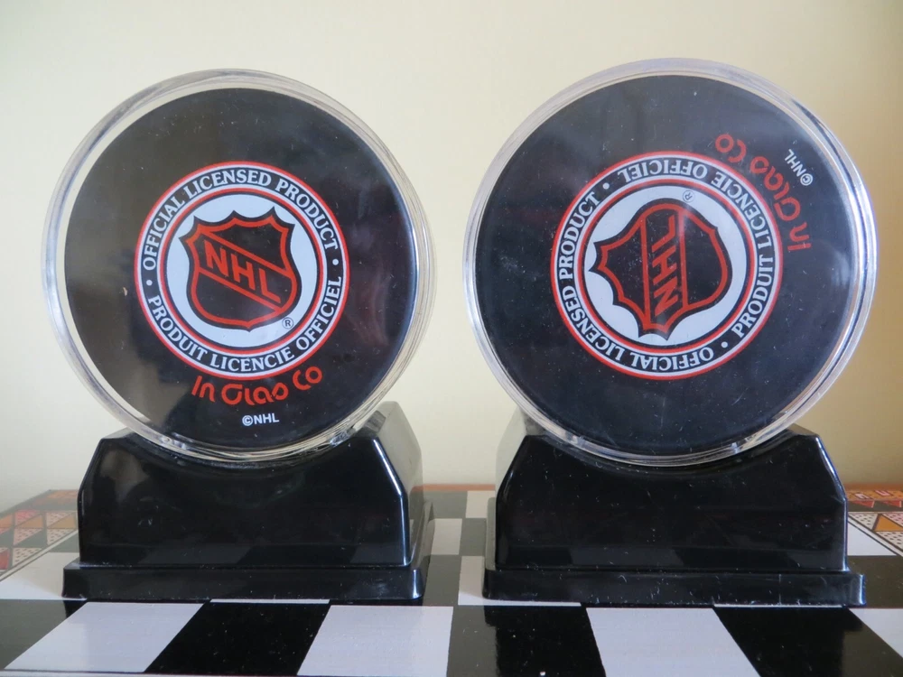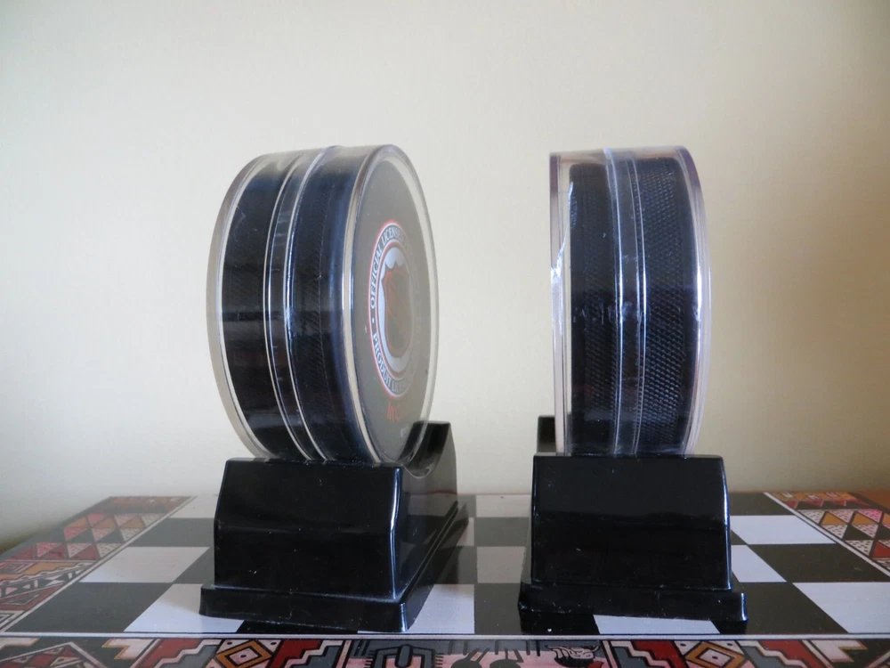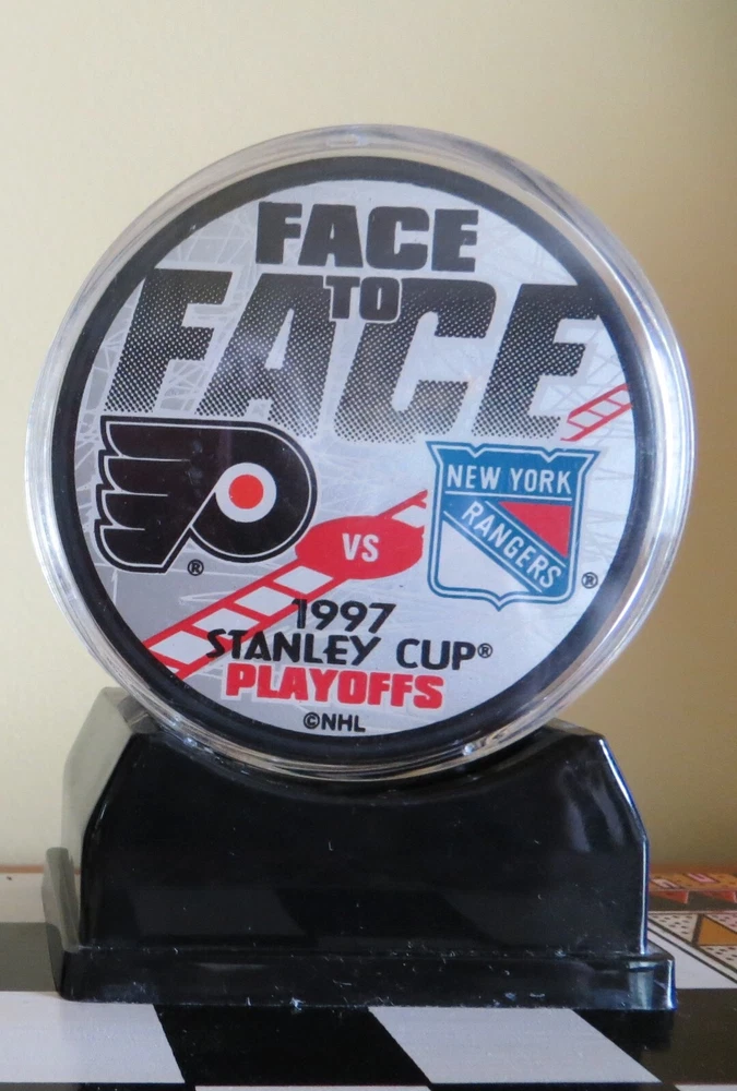 2 1997 Stanley Cup Hockey Pucks - Philadelphia Flyers vs. NY Rangers playoff and Flyers vs. Detroit Red Wings FINALS. Includes plastic stands.
