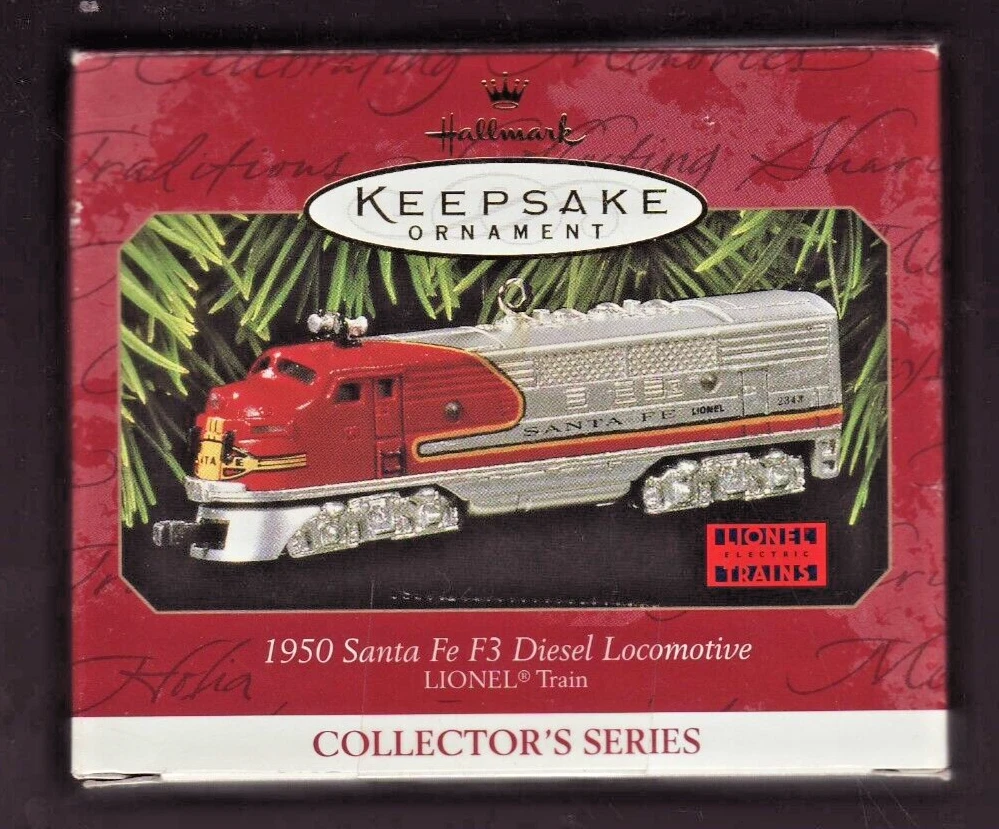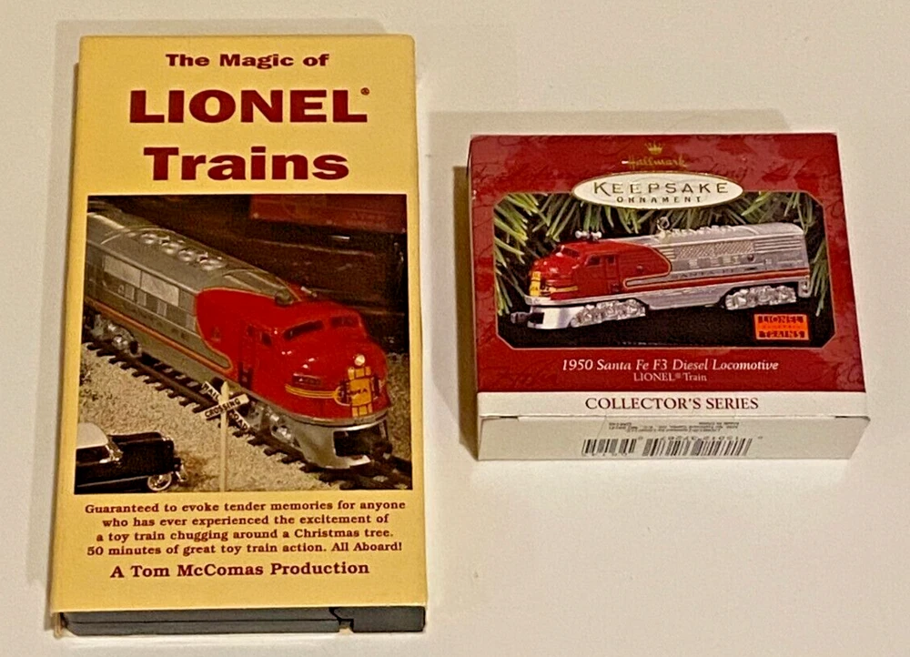 1997 Hallmark Keepsake Ornament. . 1950 SANTA FE F3 DIESEL LOCOMOTIVE. also included is the 1993 VHS tape THE MAGIC OF LIONEL TRAINS 1993 VHS. The ornament is the 2nd in the series. This is one of the longest runs at Hallmark, this year was the 29th in the series. The box has some light wear, There is some clear tape on the top and bottom of the box and a small ding on the back upper right. but the ornament looks like new with what appears to be original packing,. The price tag is attached and the retail was $18.95.......Made of DIE CAST METAL. The VHS tape is in excellent condition, the case has very little wear, the tape looks almost new, maybe never played. A great combo for the Train lovers in the world!! From a smoke free environment. Will be wrapped and padded in bubble wrap and/or popcorn then shipped in a solid box with full tracking. .....See my store for other Hallmark specials, From the 1980's forward, email with questions, I do combine shipping,.... For multiple purchases please use your "CART" then hit the "REQUEST TOTAL FROM SELLER" tab and I will send you an invoice.
