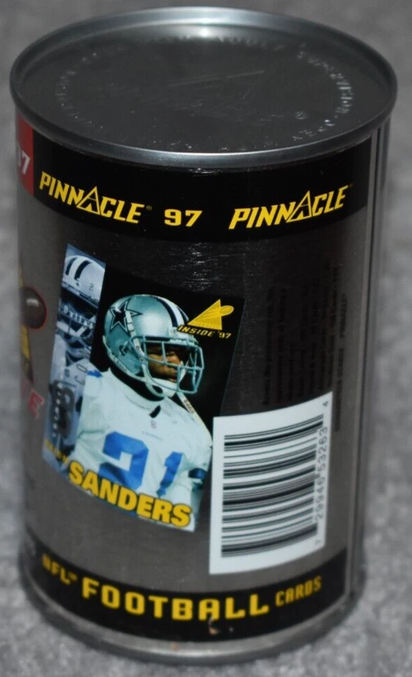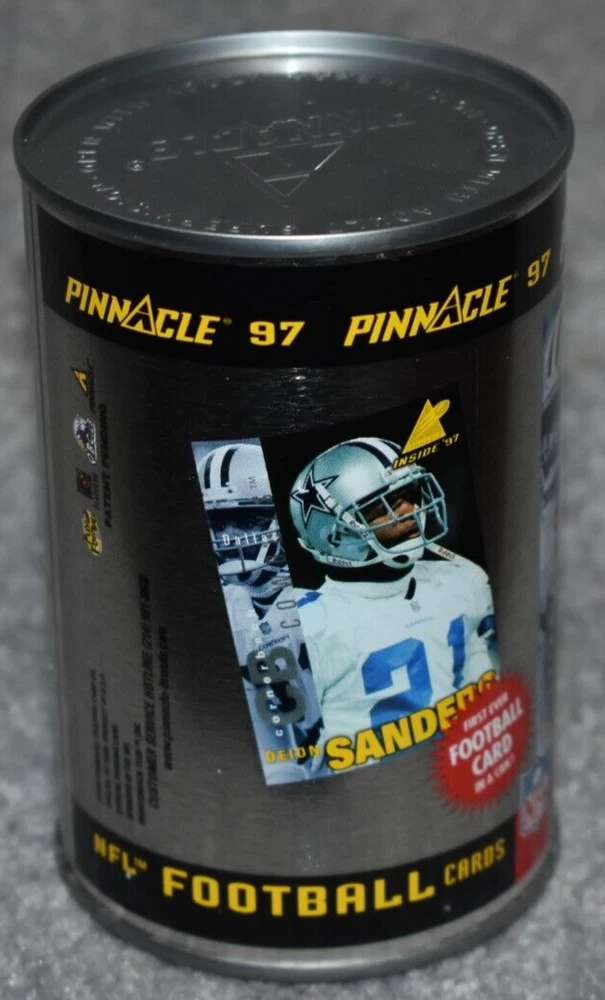 THIS IS A LISTING FOR 1997 PINNACLE INSIDE CARDS IN A CAN. CONTAINS 1 PACK OF CARDS WITH TEN CARDS IN THE PACK. THE CAN PICTURES DALLAS COWBOYS DEION SANDERS. IT IS NOT OPENED. IT MAY/HAS SLIGHT MARK/MARKS ON TOP/SIDES OF THE CAN AS PICTURE SHOWS. IF YOU HAVE ANY QUESTIONS PLEASE CONTACT ME BEFORE PURCHASEING THE ITEM. GREAT COLLECTORS ITEM. I ACCEPT EBAY ONLINE PAYMENTS AND PAYPAL. MOST ORDERS ARE SHIPPED IN ONE BUSINESS DAY. THANKS FOR LOOKING AND HAVE A GREAT DAY. On Sep-18-02 at 02:56:00 PDT, seller added the following information: After purchasing, pay instantly with your credit card through PayPal!