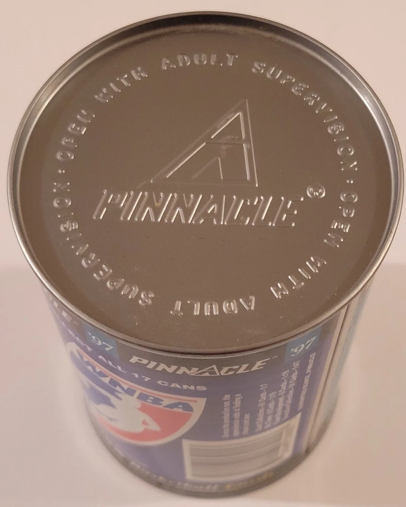 This listing is for the hard to find 1997 Pinnacle Inside WNBA Sealed Can featuring the Vicky Bullett rookie card image with a sealed pack of 10 cards inside it as pictured above. These vacuum sealed steel cans are extremely colorful as can be seen in the photos and are rarely found sealed with the 10 card pack. They are from the original first series release and are not found very often as supplies have dried up! This can is approximately 4 1/2" tall, almost 3" in diameter, is in great condition with only very minor signs of wear (possible light scratches or dents), and has no rust as is often found on these over 25 year old collectibles! If you were to decide to open the can and then the inner pack, the odds for the different inserts are; Court Collection (81 cards) 1:7 packs, Executive Collection (81 cards) 1:47 packs, My Town (8 cards) 1:19 packs, and Team Development (8 cards) 1:19 packs Any odd reflection spots or color patterns in the images are likely from the camera. Domestic shipping will be free. International bidders please email us for a shipping quote. We do accept eBay payments. If you are an international bidder, we may require that you pay for insured USPS Global Priority Mail for this item so that there will be a tracking number and full protection. Please take a look at our other items available for sale. If you have any questions at all, please feel free to email us.