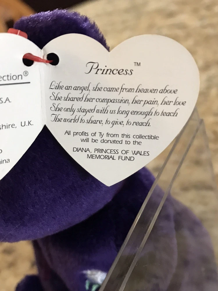The product is a rare 1997 Princess Diana Beanie Baby by Ty. This collectible plush toy features the iconic Princess Diana design and is part of the original Beanie Babies series. With its limited availability in 1997 and the brand's reputation for quality, this Beanie Baby is sought after by collectors and fans of both Princess Diana and Ty products. I consider it new since I acquired it I have kept it in the acrylic box to keep it away from dust and moisture! Please see the pictures for more item descriptions.