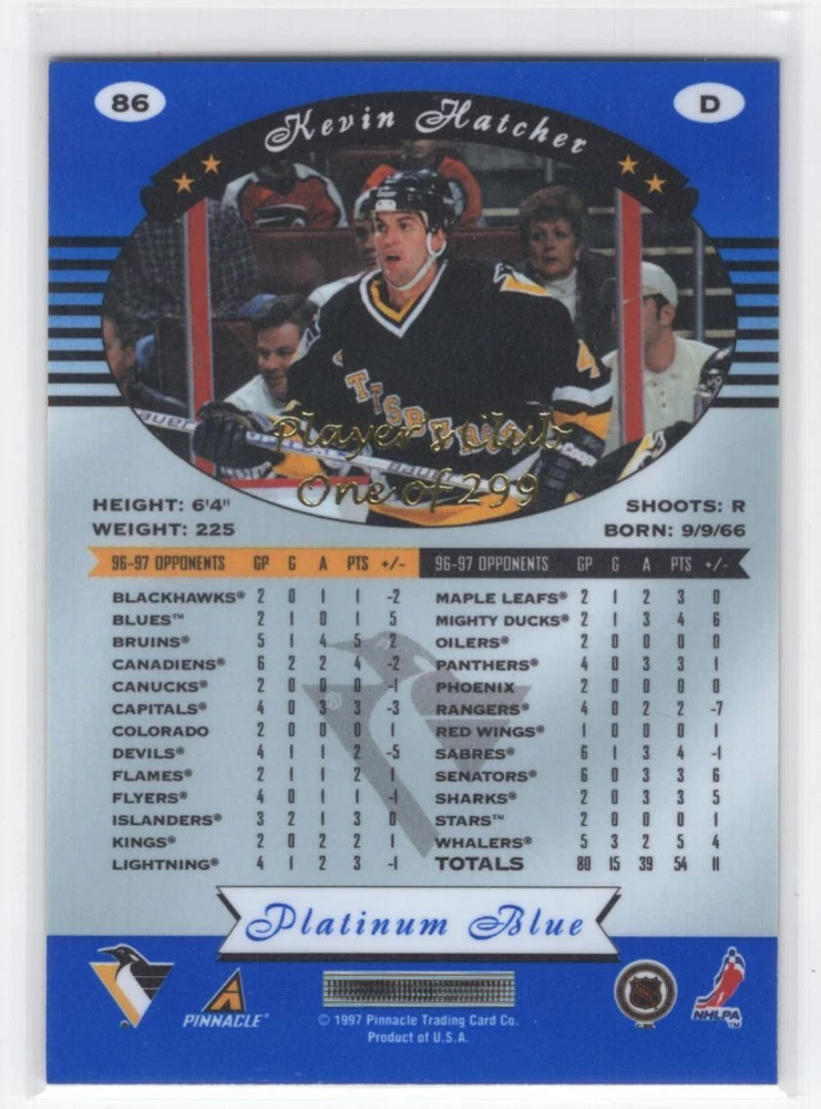About Me Other Listings Feedback Add to Favorites Contact Me eBay Store Striking Cards 901 1997-98 SSP Kevin Hatcher /299 Pittsburgh Penguins #86 No stock photo / These are real scans or pictures Details Description: Kevin Hatcher Category: Hockey Year: 1997 Product: Pinnacle Totally Certified Platinum Blue Set: SSP Team: Pittsburgh Penguins Card Number: 86 Serial Number: /299 Dimensions: 3¾" x 2½" SKU: HK B0001 R01 H (701) Listing By Kronocard trading cards software v2.7.0.1