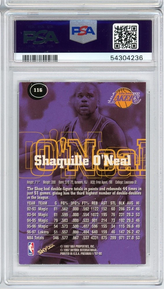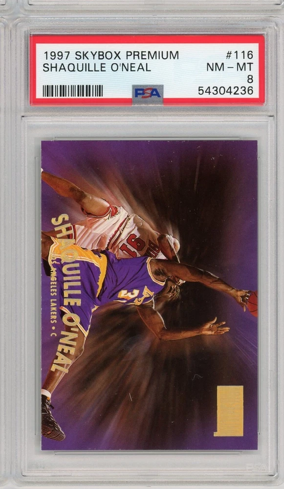 Elevate your basketball card collection with the 1997-98 Skybox Premium #116 featuring the legendary Shaquille O'Neal. This card, a testament to Shaq's dominance during his tenure with the Los Angeles Lakers, is a must-have for fans and collectors alike. Graded 8.5 by Beckett Grading Services, the card is preserved in a fresh slab, ensuring its premium quality. As a standout piece from the 1997-98 Skybox Premium set, this card captures the essence of the NBA icon. It's not autographed, allowing the focus to remain on the high-quality print and design that SkyBox is known for. Whether you're a long-time collector or just starting out, this card is an excellent addition to any NBA memorabilia collection.