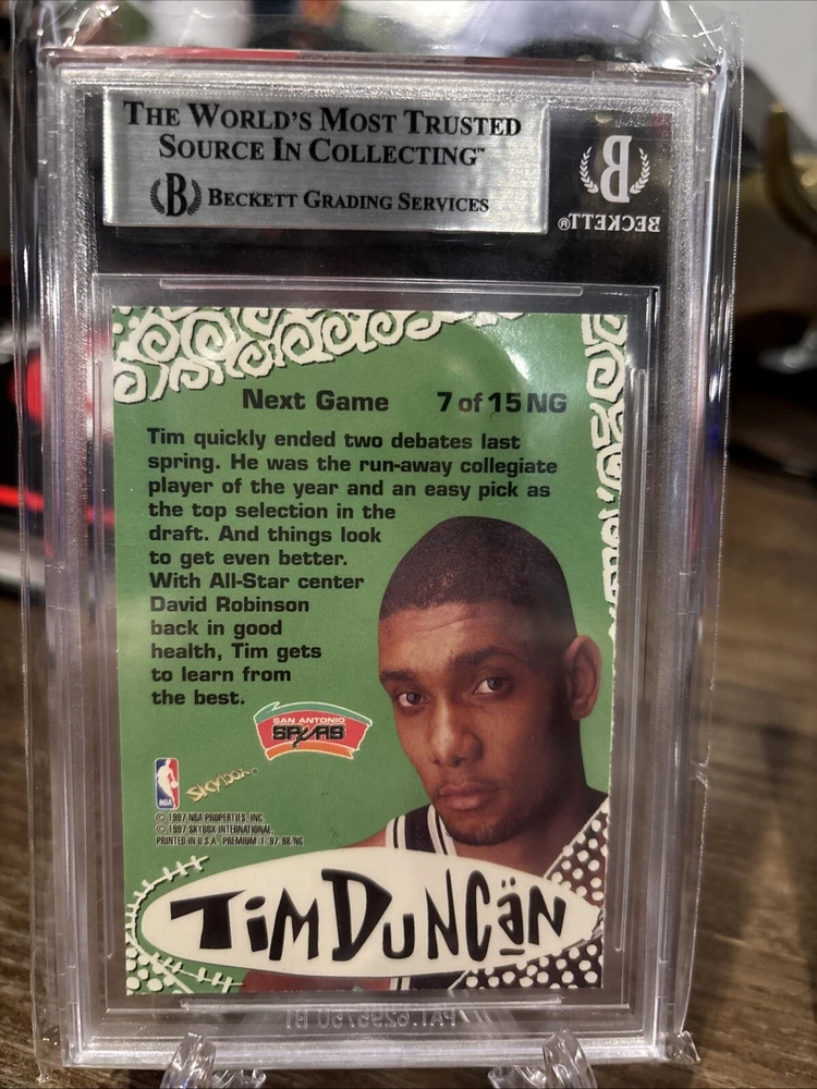 Capture a piece of basketball history with the 1997-98 Skybox Premium Next Game #7 Ng Tim Duncan Rookie card. As a standout piece for any collector, this card features the legendary Tim Duncan during his inaugural season with the San Antonio Spurs. Graded by Beckett Grading Services (BGS) at an impressive 8.5, it's a Near Mint to Mint+ gem that showcases the early promise of a future Hall of Famer's career. The card is a must-have for aficionados of the NBA and sports memorabilia. With its premium quality and the cachet of a rookie card, it's a valuable addition to any collection. Proudly display your passion for the sport and commemorate the beginnings of an iconic player's journey in professional basketball.
