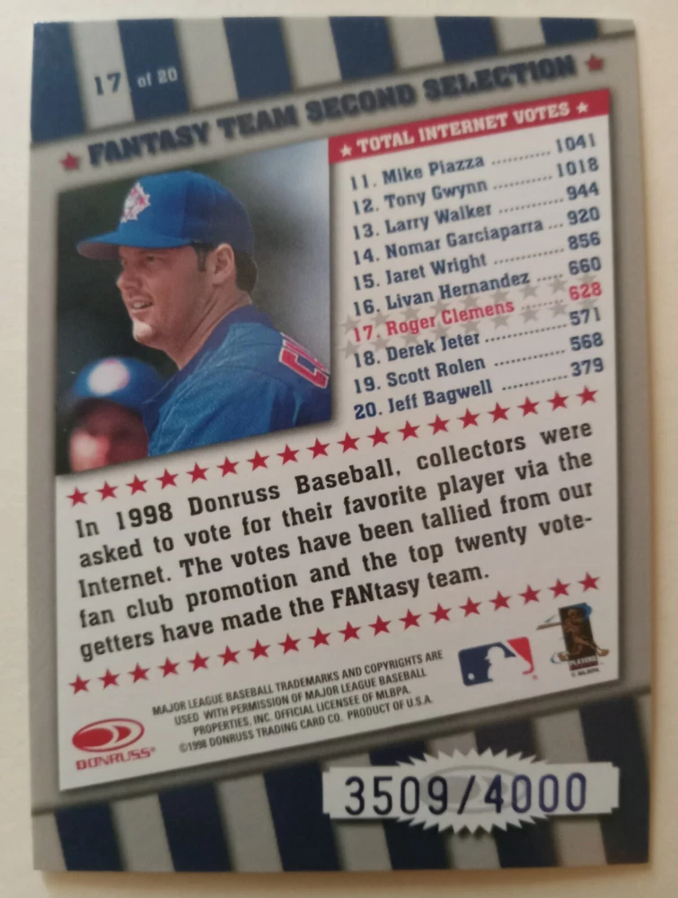 The product is a 1998 Donruss Fantasy Team trading card featuring Roger Clemens from the Toronto Blue Jays. This card is part of a set of 20 and is numbered 17 out of 4000, making it a limited edition collectible. The card showcases a hologram parallel variety and is manufactured by Pinnacle/Score under the Donruss brand, specifically for the Major League Baseball season of 1998. This original sports trading card is a valuable piece for any baseball card collector interested in modern MLB memorabilia.