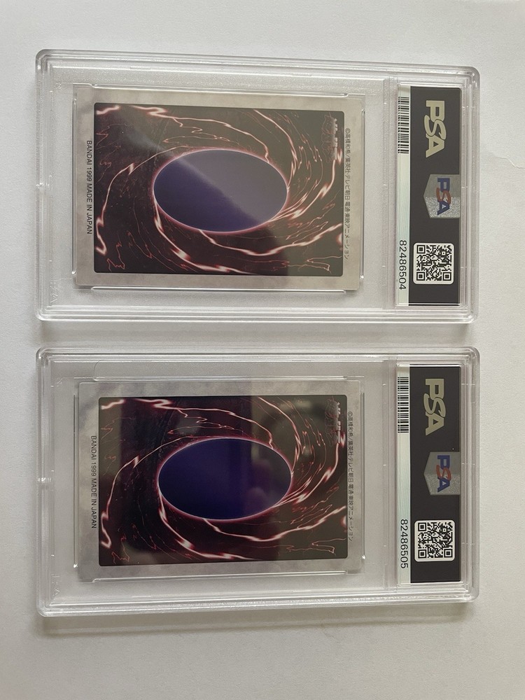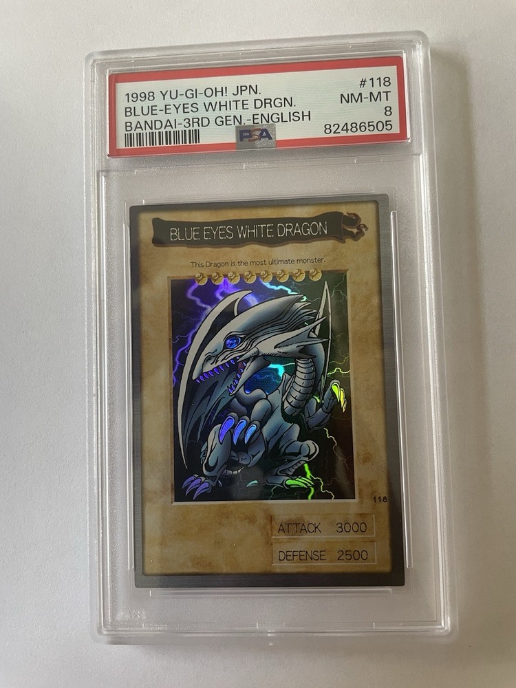 Elevate your Yu-Gi-Oh! TCG collection with the iconic Blue-Eyes White Dragon card, a staple from the Bandai set. This particular card is a third-generation print from 1998, boasting a PSA grade of 8, ensuring its quality and authenticity. A must-have for serious collectors and duelists, the card features stunning full art with a holographic finish that captures the essence of this powerful Basic Stage creature. The Blue-Eyes White Dragon card is secret rare, language-English, and comes from a time when cards were manufactured in Japan. It's a true vintage piece, reflecting the early days of the Yu-Gi-Oh! trading card game. Please note that this is not an autographed item, and the card size is standard. Add this legendary creature to your collection and enjoy the prestige it brings to your game. This comes with both blue eyes white dragon psa 8 Bandai cards.The serial numbers are 82486504 and 82486505.