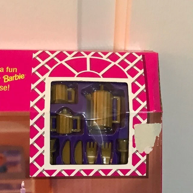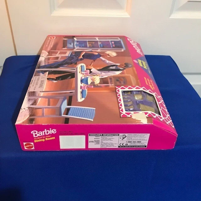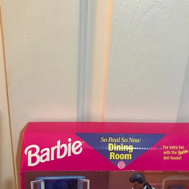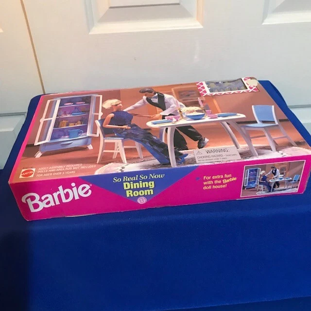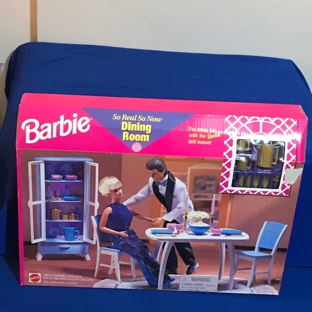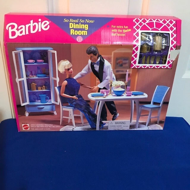 SO REAL SO NOW FROM MATTEL IS A VERY POPULAR VINTAGE COLLECTIBLE BARBIE SERIES. THIS DINING ROOM SET (67551-94) INCLUDES DINING TABLE AND TWO CHAIRS ALONG WITH ACCESSORIES FOR AN ELEGANT DINNER. THE BOX IS IN GREAT CONDITION, MINOR SHELF WEAR AND NEVER BEEN OPENED. THERE IS A SPOT ON THE FRONT OF THE BOX WHERE THE PRICE TAG HAS BEEN REMOVED (SEE PICS). DOLLS ARE NOT INCLUDED. ONCE PURCHASED THE ITEM WILL BE CAREFULLY WRAPPED AND PACKAGED TO ENSURE SAFE ARRIVAL. THANK YOU FOR YOUR CONSIDERATION.
