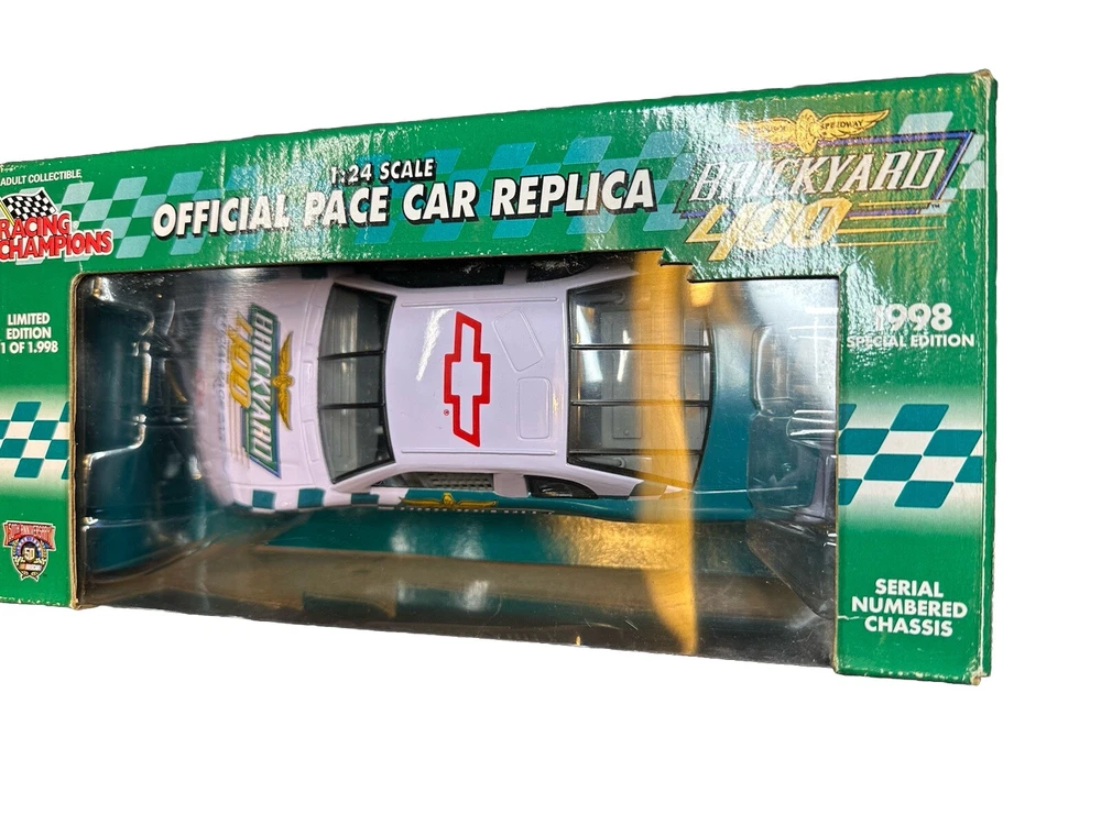 This 1998 Brickyard 400 Chevy Chevrolet Pace Car Replica 1:24 NASCAR is a must-have for any NASCAR fan or collector. The iconic car, featuring the Chevrolet logo and NASCAR branding, is beautifully detailed and perfectly sized for display or play. With its brand name Lionel, this diecast car is of the highest quality and will make a great addition to any collection. Whether you're a fan of the Cars character family or simply love sport and touring cars, this 1:24 scale model is sure to impress. Don't miss out on the chance to own this piece of NASCAR history.