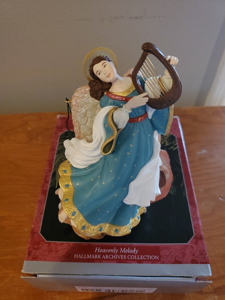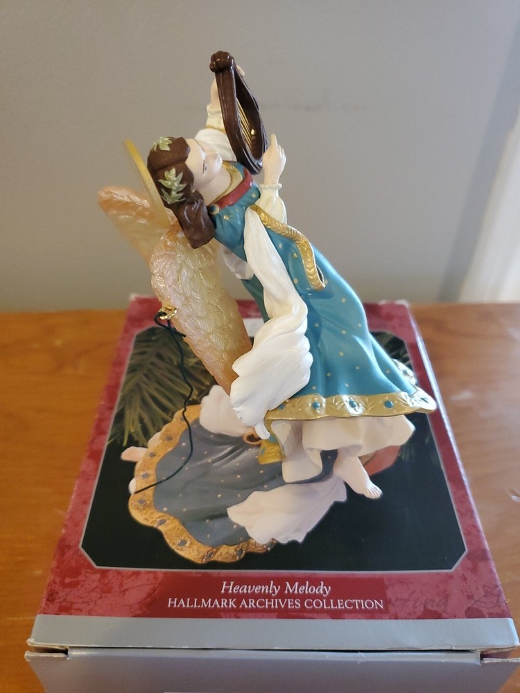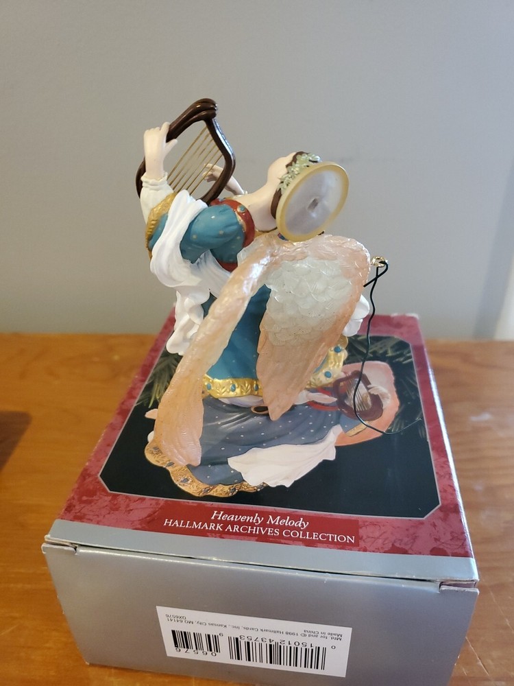 This is a vintage 1998 Hallmark Angel "Heavenly Melody" Keepsake Christmas Ornament in its original box. The ornament features a small multicolor angel figurine with a height of 5.25 inches, a length of 4 inches, and a width of 2.75 inches. It is part of the Angel franchise and collection, perfect for Christmas decor. The ornament is in excellent condition with no chips or cracks. The box has some scuffing around the corners, but no damage to the ornament. Located on Hallmark Shelf