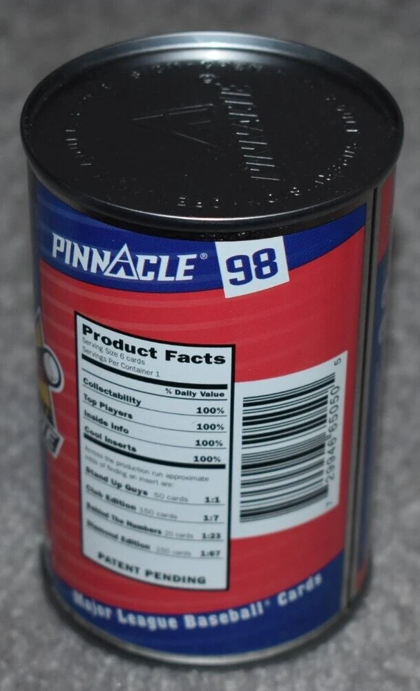 THIS IS A LISTING FOR 1998 PINNACLE INSIDE CARDS IN A CAN. CONTAINS 1 PACK OF CARDS WITH SIX CARDS IN THE PACK. THE CAN PICTURES MONTREAL EXPOS VALDIMIR GUERRERO. IT IS NOT OPENED. IT HAS SLIGHT MARK/MARKS ON TOP OF THE CAN AS PICTURE SHOWS. IF YOU HAVE ANY QUESTIONS PLEASE CONTACT ME BEFORE PURCHASEING THE ITEM. GREAT COLLECTORS ITEM. I ACCEPT EBAY ONLINE PAYMENTS AND PAYPAL. MOST ORDERS ARE SHIPPED IN ONE BUSINESS DAY. THANKS FOR LOOKING AND HAVE A GREAT DAY. On Sep-18-02 at 02:56:00 PDT, seller added the following information: After purchasing, pay instantly with your credit card through PayPal!
