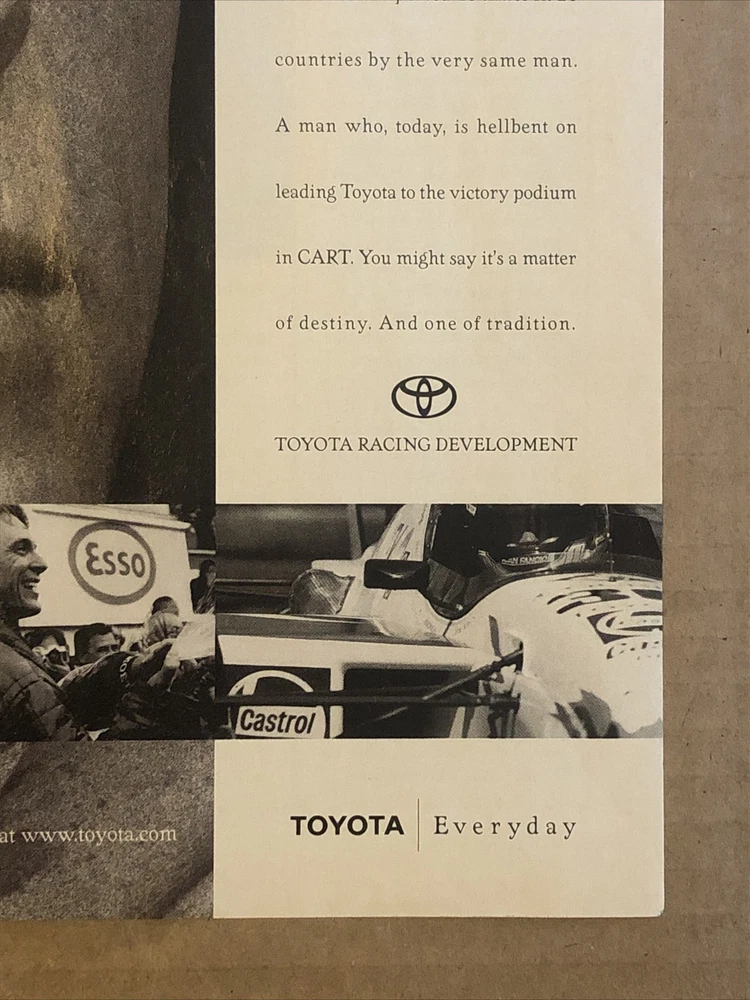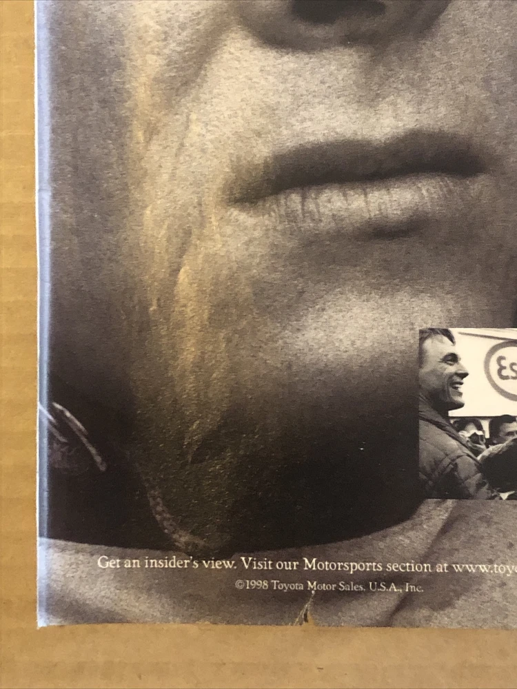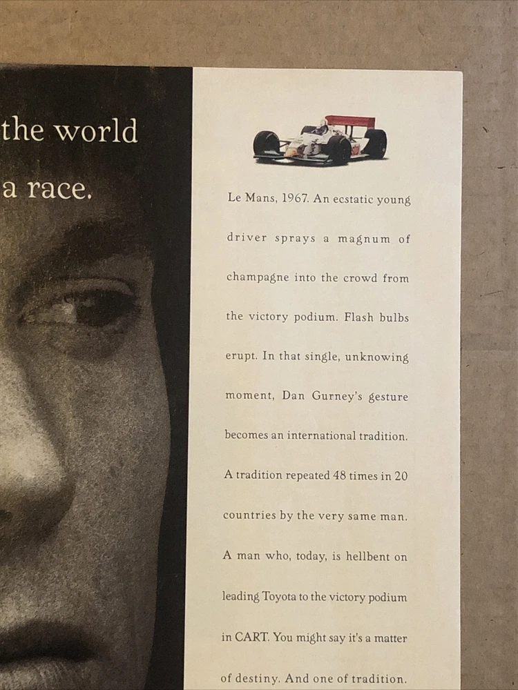 Take a trip down memory lane with this vintage 1990s Toyota Racing Print Ad featuring racing legend Dan Gurney at the 1967 Le Mans race. The black and white ad showcases the iconic Toyota racing car with a champagne spray in the air, capturing the excitement and thrill of the race. The ad is an original piece from 1998, making it a rare find for collectors who appreciate the history and legacy of Toyota's racing heritage. The ad is perfect for fans of automobile racing and Toyota enthusiasts who want to add a unique piece to their collection. The ad is a magazine print ad and is in good condition. Get your hands on this original piece of Toyota history and relive the glory days of racing with Dan Gurney and the iconic Toyota racing car. Original approximate 8”x11” vintage magazine print ad.