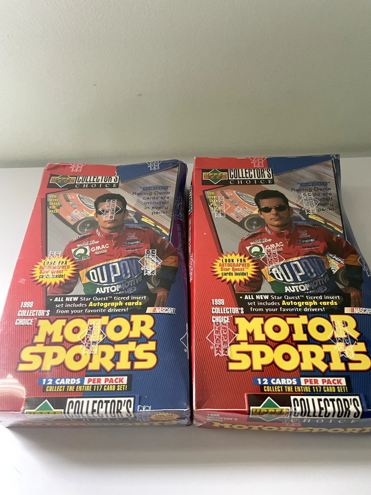 The 1998 Upper Deck Motorsports NASCAR Collector's Choice Hobby Box is a sealed box containing sports trading cards focused on auto racing, specifically NASCAR. Manufactured by Upper Deck in 1998, this collector's choice set offers cards from the 1998 season. This hobby box is a sought-after item for fans and collectors of NASCAR trading cards, providing a nostalgic glimpse into the world of auto racing during that time period.