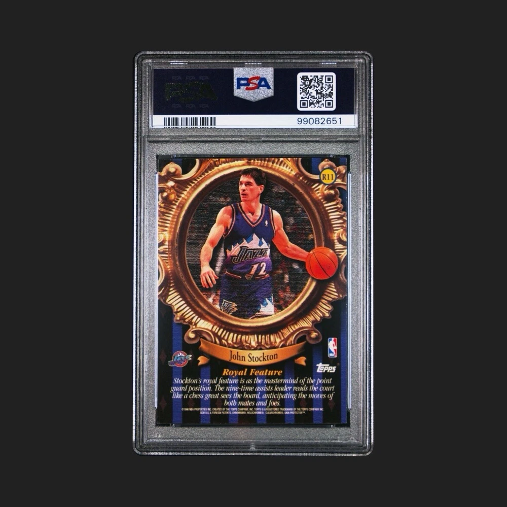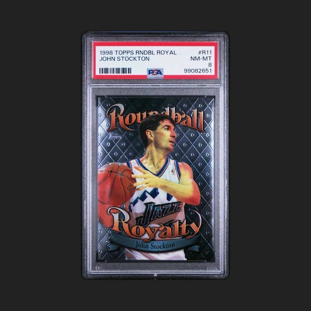 RARE! PSA population 2, only 3 higher. This 1998-99 Topps Roundball Royalty #R11 sports trading card features John Stockton of the Utah Jazz in the National Basketball Association (NBA). The card is graded by Professional Sports Authenticator (PSA) and has a grade of 8. It is an insert card from the 1998-99 Topps set and is perfect for any basketball fan or collector.