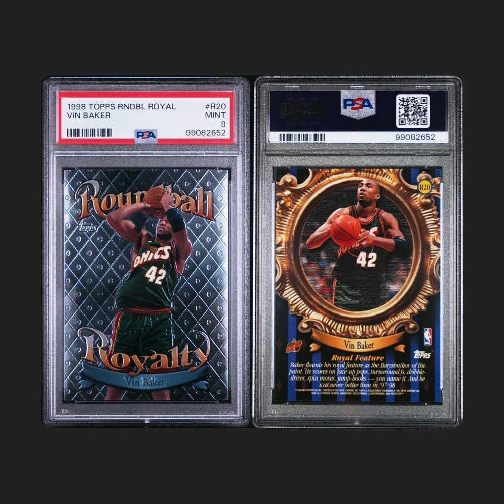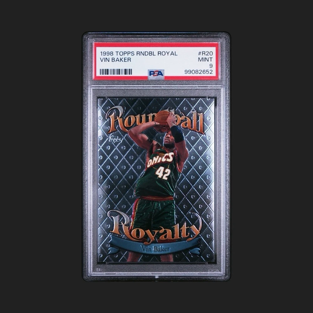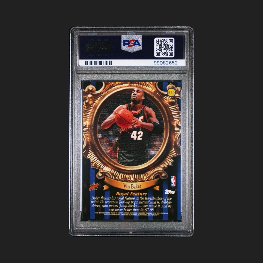 RARE! PSA population 2, 0 higher. This 1998-99 Topps Roundball Royalty sports trading card features Vin Baker of the Seattle Supersonics. Graded 9 by Professional Sports Authenticator (PSA), this card is a great addition to any basketball fan's collection. The card is from the 1998-99 season and is part of the insert set.