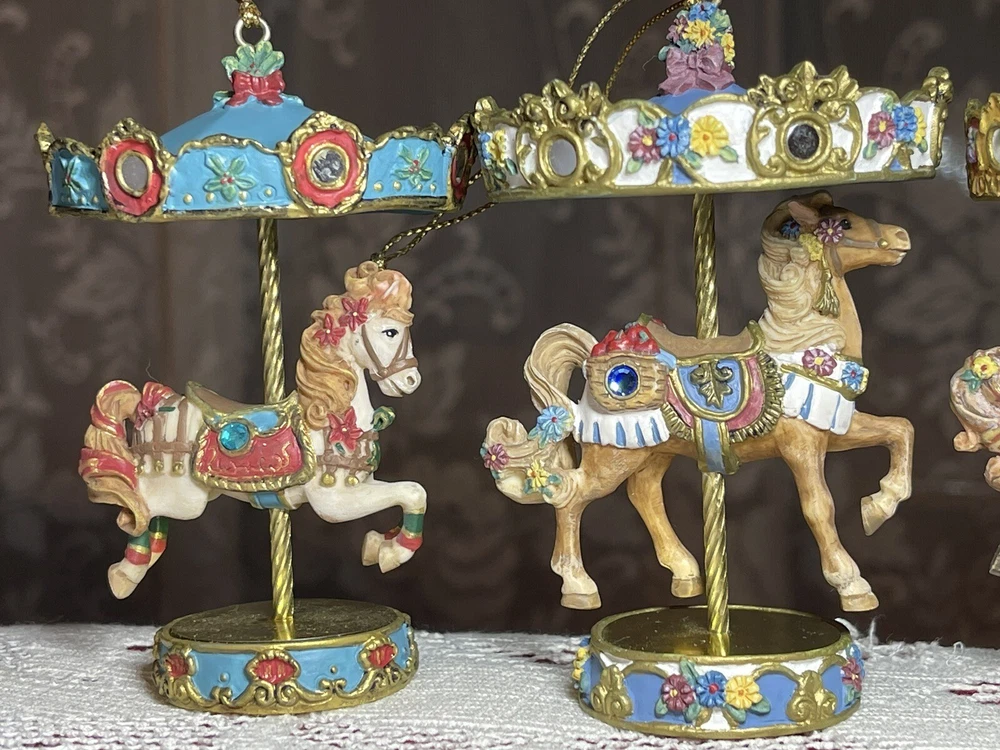 Enhance your holiday decorations with this beautiful set of 8 Bradford Edition Carousel Horse Ornaments. Crafted with exquisite details, these multicolored ornaments are perfect for any collector or horse lover. Each ornament portrays a different horse, representing a season or holiday, making them a great addition to your Christmas tree or year-round decor. The set includes a variety of horses from the Bradford Exchange, all manufactured in 1999. Don't miss out on this unique collection of carousel horse ornaments. Stones are intact on each side of horse except for one side, light green stone, on Summertime Cantor. I have relisted them and lowered the price because 4 of the 8 have repairs in the resin pictured and one with missing lower leg, can’t really tell on a tree but priced accordingly. These are really detailed and beautiful! Need a new home that would appreciate them.