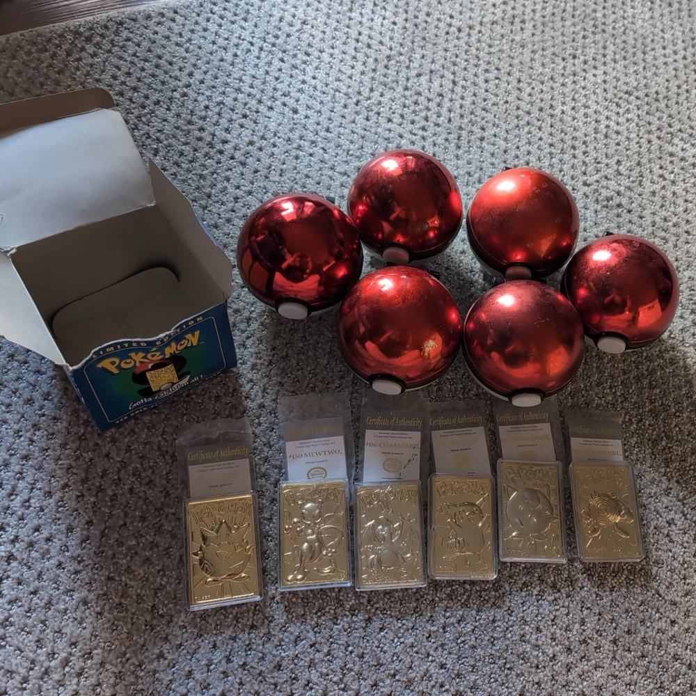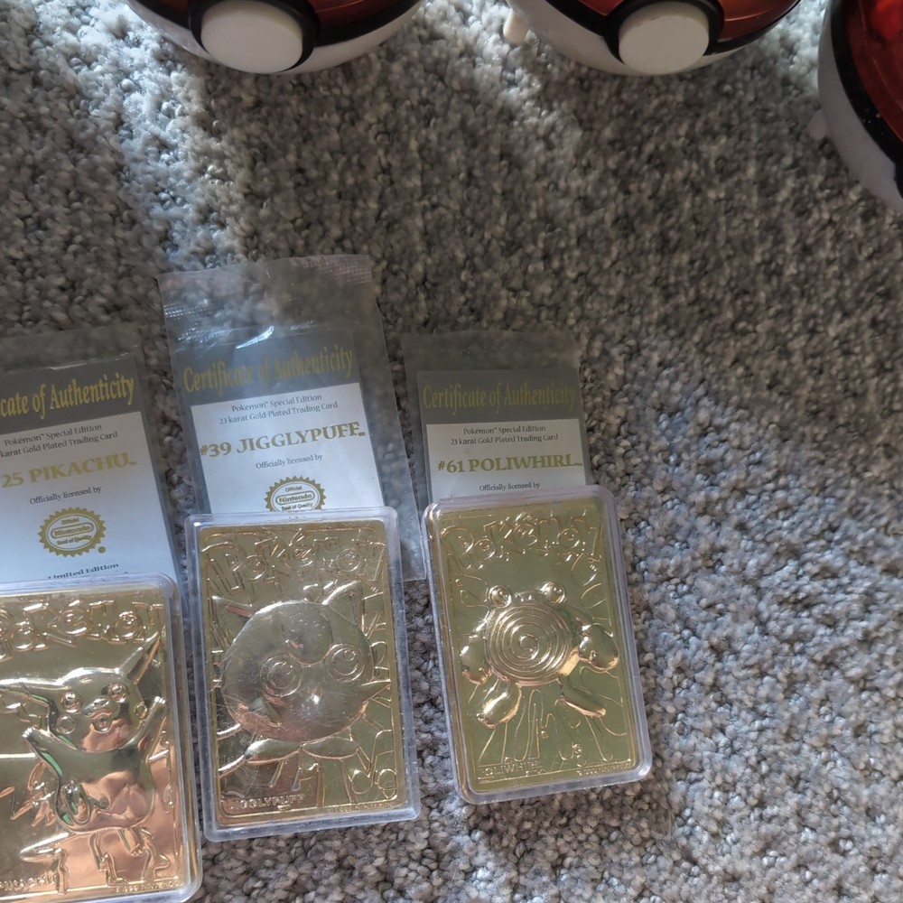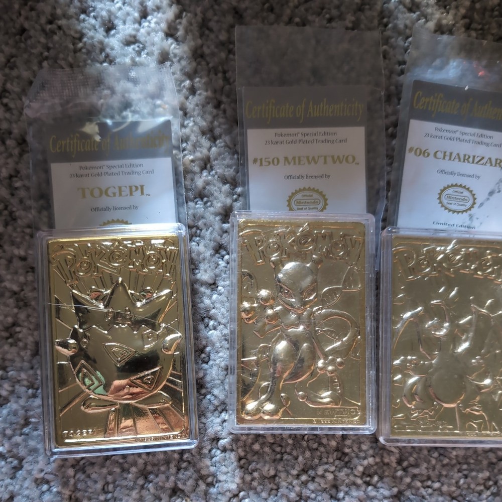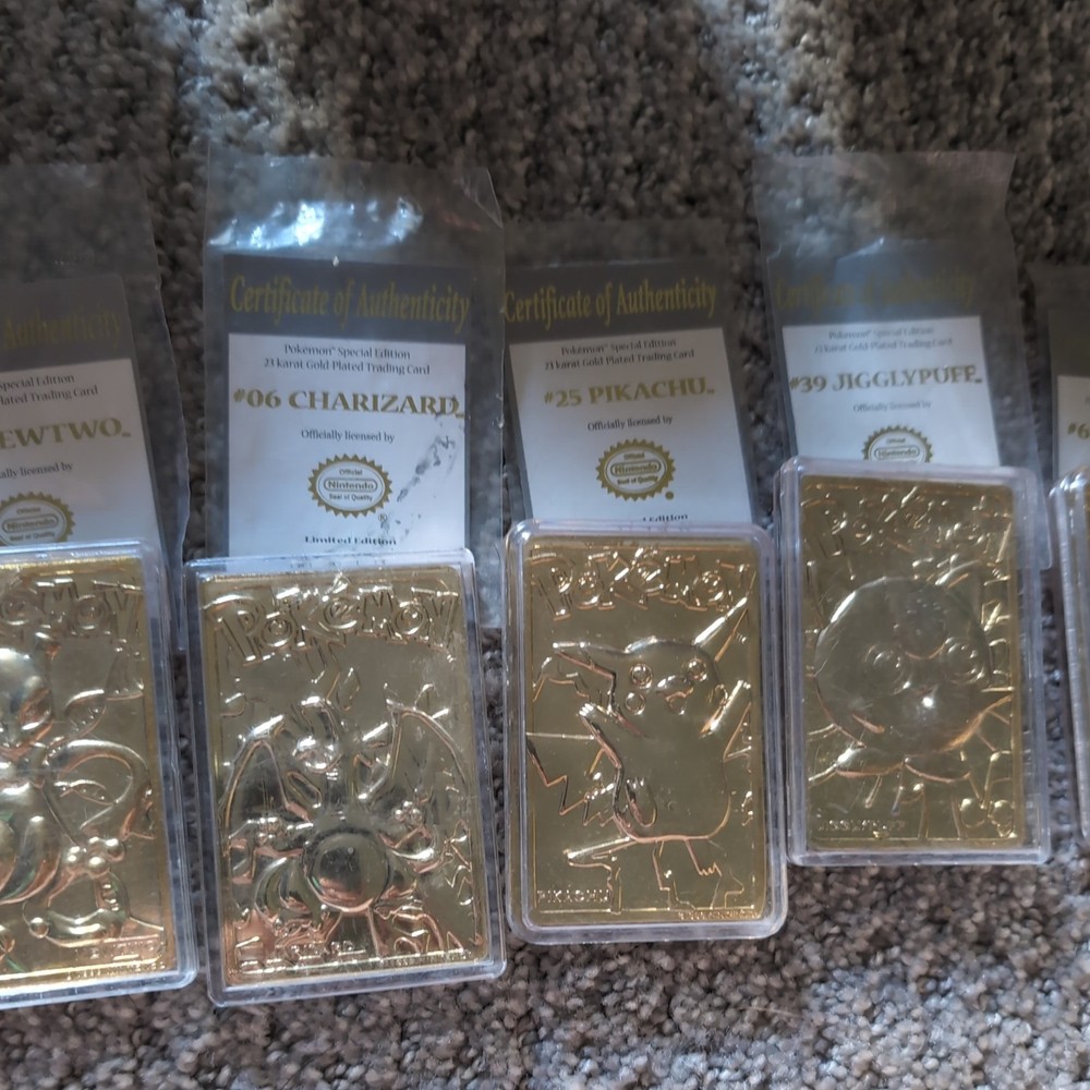 This product is a full set of 1999 Pokemon 23k Gold Plated Trading Cards from Burger King. The set includes characters like Pikachu, Togepi, Charizard, Jigglypuff, Mewtwo, and Poliwhirl. These cards are made of metal and are considered rare due to their gold plating. They are part of the Pokémon TCG game and are in English. These limited edition and exclusive cards are highly sought after by collectors and fans of the Pokémon franchise.