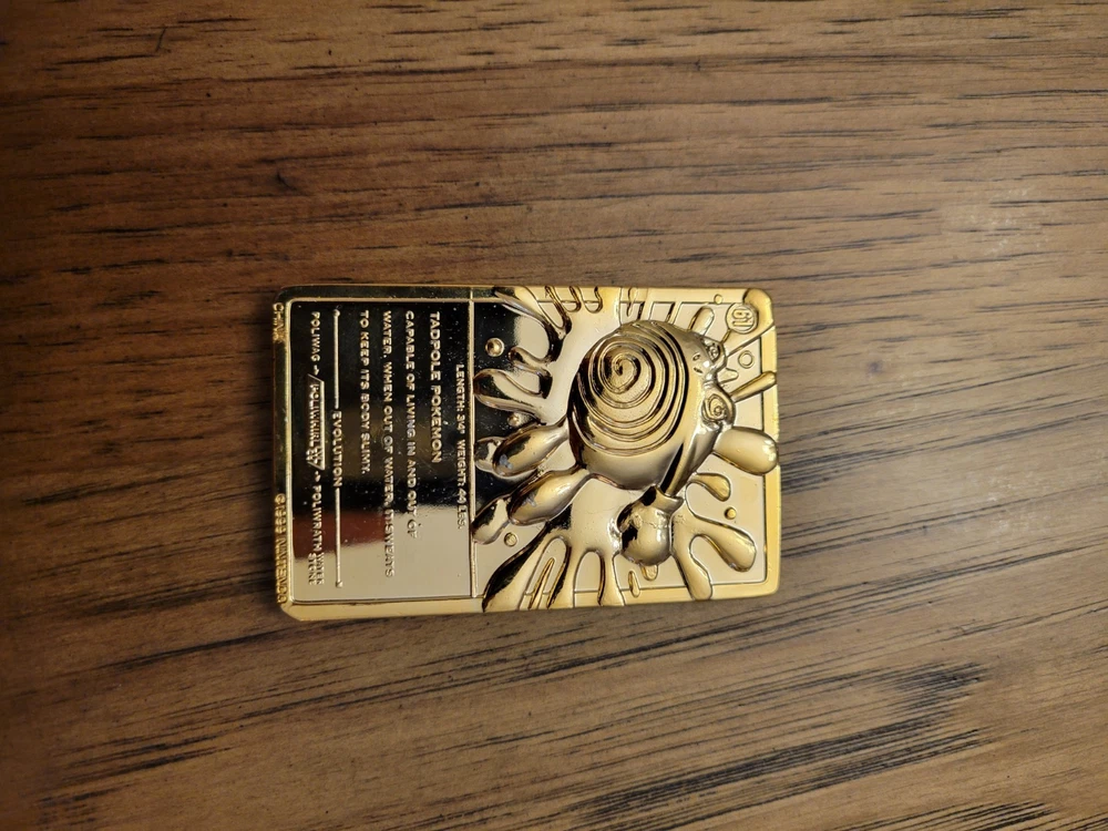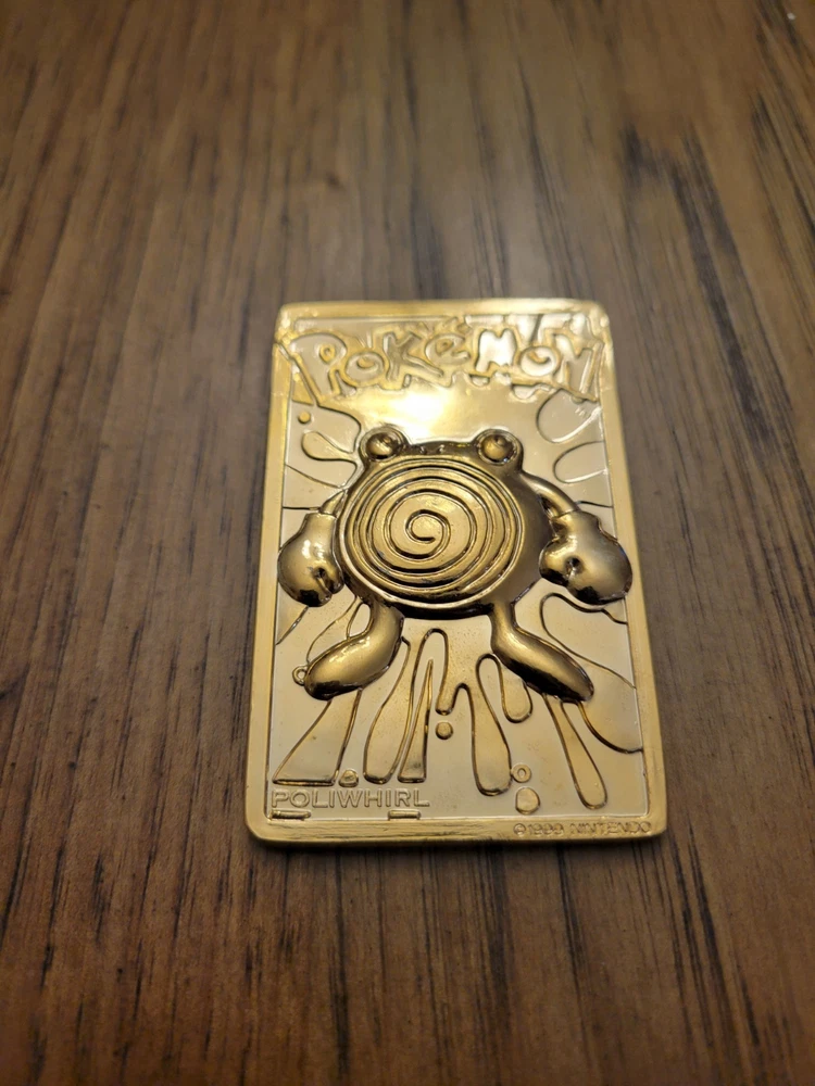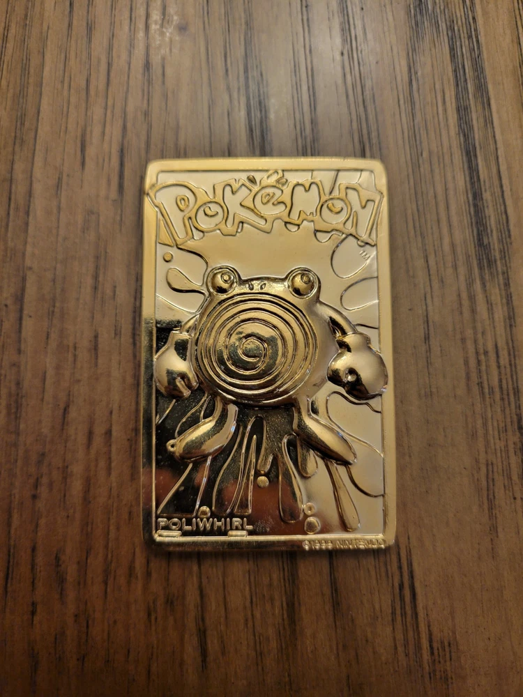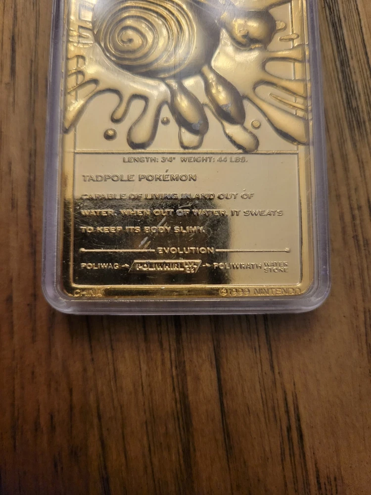 Pokemon POLIWHIRL Gold Plated Trading Card 1999 Nintendo With Case Card has been in it's case basically it's entire existence but does show a few signs of wear. I got this when they were released and have had this in my collection since. Notable wear includes a couple chips in the rear bottom border of card to the right of CHINA as well as worn sections on Poliwhirl's feet also on rear of card. Face of card has a few faint scratches and there are a couple pin sized chips above Poliwhirl on front face of card. Plastic case has a scratch on the back and a few light surface scratches. Feel free to reach out with further questions.