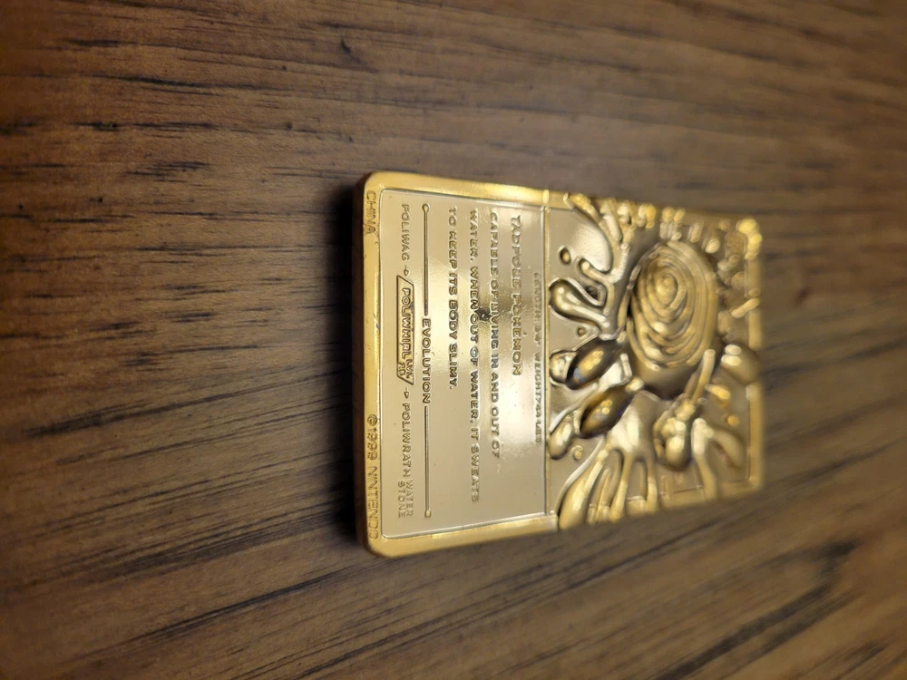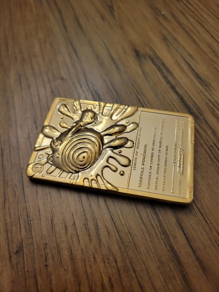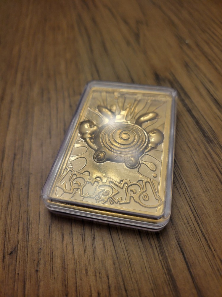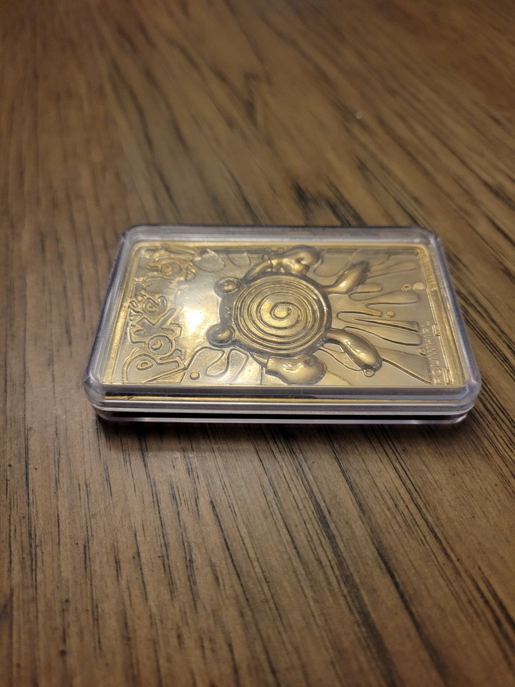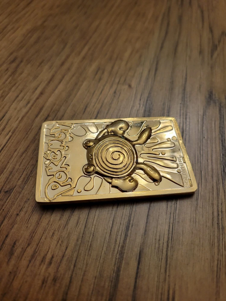 Pokemon POLIWHIRL Gold Plated Trading Card 1999 Nintendo With Case Card has been in it's case basically it's entire existence but does show a few signs of wear. I got this when they were released and have had this in my collection since. Notable wear includes a couple chips in the rear bottom border of card to the right of CHINA as well as worn sections on Poliwhirl's feet also on rear of card. Face of card has a few faint scratches and there are a couple pin sized chips above Poliwhirl on front face of card. Plastic case has a scratch on the back and a few light surface scratches. Feel free to reach out with further questions.