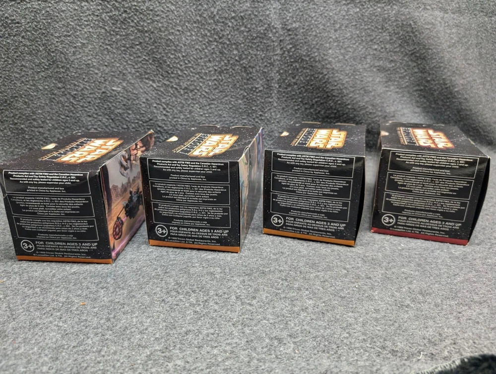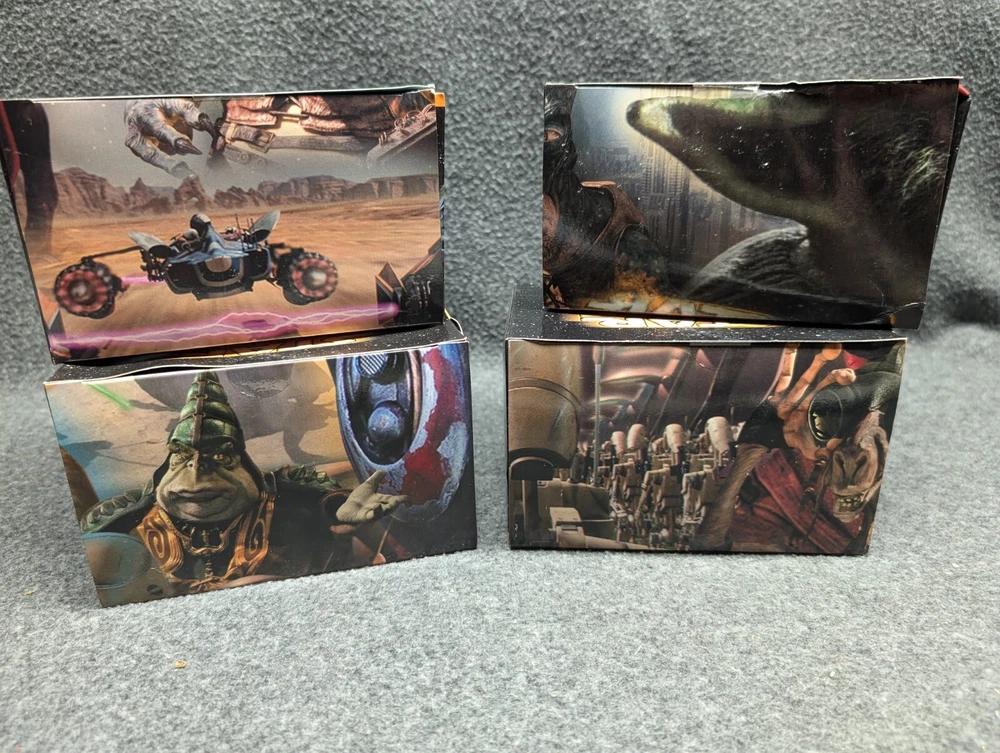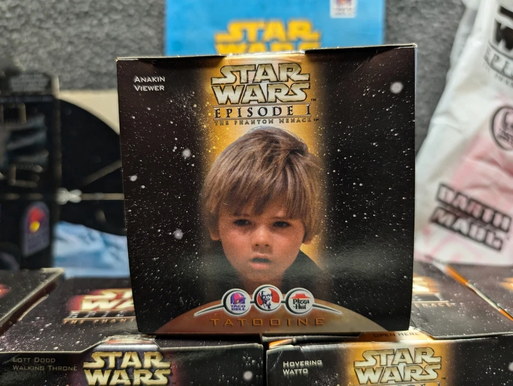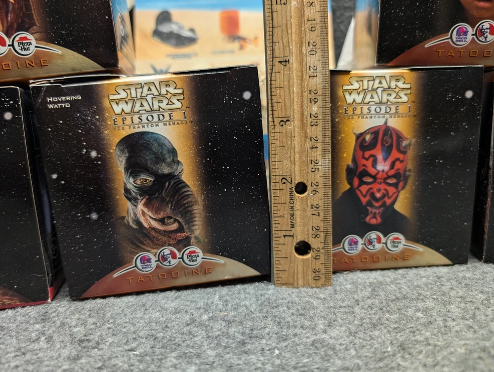 The product is a set of 11 Star Wars Episode I toys that were included in Kids Meals at Taco Bell, KFC, and Pizza Hut in 1999. The toys are associated with the Star Wars character family and were likely part of a promotional campaign tied to the release of the movie. These toys were likely manufactured in China for distribution in the United States, where Taco Bell, KFC, and Pizza Hut are popular fast food chains. The set would be a collectible item for fans of Star Wars memorabilia and fast food promotional items. The set includes 7 toys in 2 x 2 boxes and 4 toys in 4 x 6 boxes. The boxes have never been opened with the exception of the two that I took pictures of. Also included is one kids meal paper bag, Empire strikes Back kids meal box and a plastic to-go bag with Darth Vader's picture on the side.
