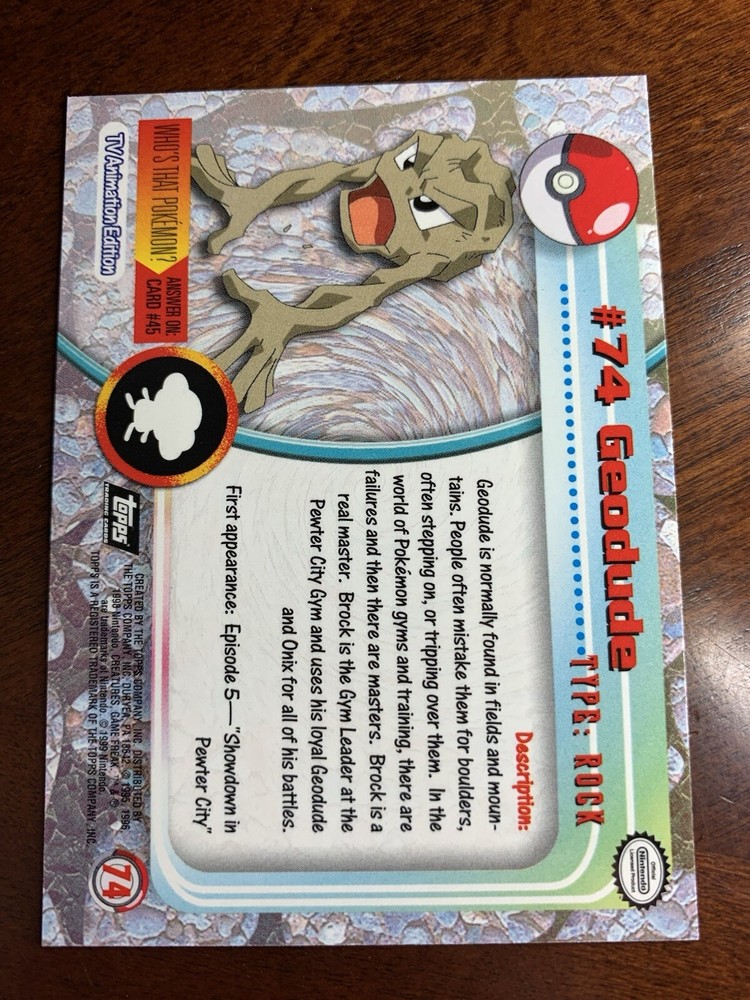 1999 Topps Pokemon TV Animation Black Logo #74 Geodude Up for sale is a 1999 Topps Pokemon TV Series card. Please review pictures as the card pictured is of the actual card that you will receive. The card will be placed in a penny sleeve and shipped in a cardboard box with delivery tracking. I have 100% positive feedback and have been selling items on ebay for many years. Let me know if you have any questions or need additional pictures and I will be happy to provide them. Yes - I do offer combined shipping. Additional shipping cost for each ungraded (raw) card is FREE and for each PSA graded item is only $0.50. Pokémon Official Trading Cards , informally known as Pokémon Trading Cards series 1 , was a set of Pokémon-themed trading cards manufactured by Topps in 1999. There were 90 cards in total: 76 Pokémon cards, 13 character cards, and a checklist card. Each of these 90 cards also had two foil card versions (silver and rainbow) in their main United States distributions. This set contained no bonus "chase cards". In the United States There were four different printings. These cards all had an oval Nintendo seal. The printings are distinguished by a blue, black, green, or red Topps logo, with card texts being updated between the first (blue) and second (black) printings. Due to an error, all foil cards after the first printing were printed with black logos, but can still be distinguished by the differences in their debossings. § 1st printing: blue logo on all cards, foil cards had a smooth texture with no debossings. § 2nd printing: black logo on all cards, Pokémon foil cards were debossed with rays and starbursts, while TV cards had a sandpaper finish. § 3rd printing: green logo on non-foil cards only, Pokémon foil cards were debossed with flames and teardrops, while TV cards had dots and rectangles. § 4th printing: red logo on non-foil cards only, Pokémon foil cards were debossed with Poké Balls and targets, while TV cards had dents. A fifth printing featuring foil cards with a smooth finish but a black logo (features of both the 1st and 2nd printings) was also produced to an uncertain extent. Pokémon Trading Cards series 2 was a set of Pokémon-themed trading cards manufactured by Topps in 2000. There were 72 cards in total: 41 Pokémon cards, 5 "Heroes & Villains" cards, 25 episode cards, and a checklist card. Each of these 72 cards also had two foil card versions (silver and rainbow). In addition, there were 27 bonus "chase cards" not included on the checklist, including 12 die-cut embossed cards, 10 animation stick-on cards, and 5 clear cards. Pokémon Trading Cards series 3 was a set of Pokémon-themed trading cards manufactured by Topps in 2000. There were 72 cards in total: 34 Pokémon cards, 12 "Heroes & Villains" cards, 19 episode cards, 6 puzzle cards, and a checklist card. Each of these 72 cards also had two foil card versions (silver and rainbow). In addition, there were 27 bonus "chase cards" not included on the checklist, including 12 die-cut embossed evolution cards, 10 pop-up cards, and 5 clear cards.